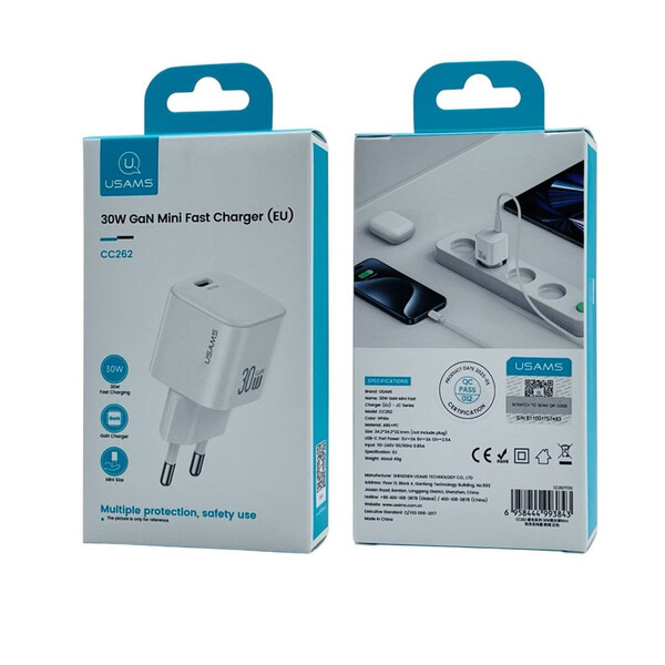 - Чип, оборудван с усъвършенствана GaN (галиев нитрид) технология за бързо и ефикасно зареждане в компактен размер. - Разполага с един Type-C порт за зареждане с максимална мощност от 30 W. - Миниатюрният размер на зарядното устройство осигурява преносимост и удобство без компромис с изходната мощност. - Разполага с цялостни мерки за безопасност, за да осигури бързо зареждане без повреждане на вашите устройства. - Поддържа множество протоколи за бързо зареждане, осигурява висока мощност от 30 W (максимум) и е обратно съвместим с режим на ниска мощност. Автоматично разпознава текущите изисквания за мощност на устройството при свързване, осигурявайки бързо и безопасно зареждане. Спецификации: Модел: CC262 Размери (без щепсела): 34,2 x 34,2 x 32,1 мм Материал: ABS пластмаса + поликарбонат Тегло: Около 49 г Мощност: 30 W USB-C Изход: 5V-3A, 9V-3A, 12V-2,5A Вход: 110-240V 50~60Hz 0,85 A