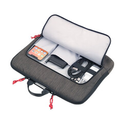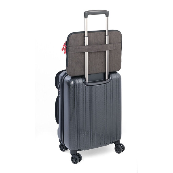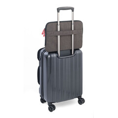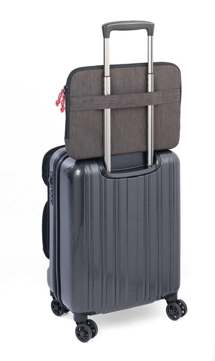 Чанта за лаптоп с 2 отделения с цип, 1 голямо отделение за лаптоп, таблет, документи (до 14"), с дръжка за носене, отделна еластична лента за притягане и допълнителна защита от удар благодарение на подплатените ъгли, 1 малко отделение за аксесоари с 2 отделения и еластични ленти, включително тайно отделение за мини устройства за проследяване (напр. APPLE AirTag®), примка за закрепване към количката, 100% полиестер, полиестер, черно / сиво