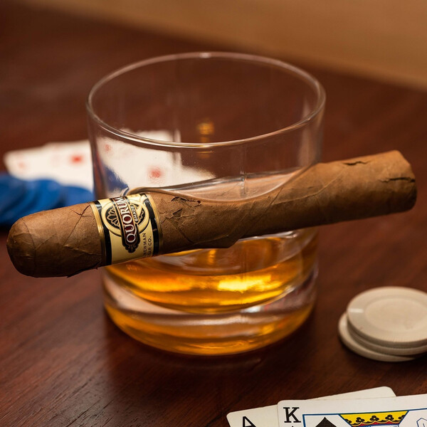 Издръжлива чаша за уиски с вградена поставка за пури, предназначена да държи здраво любимата ви пура.