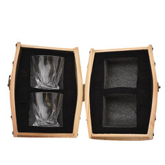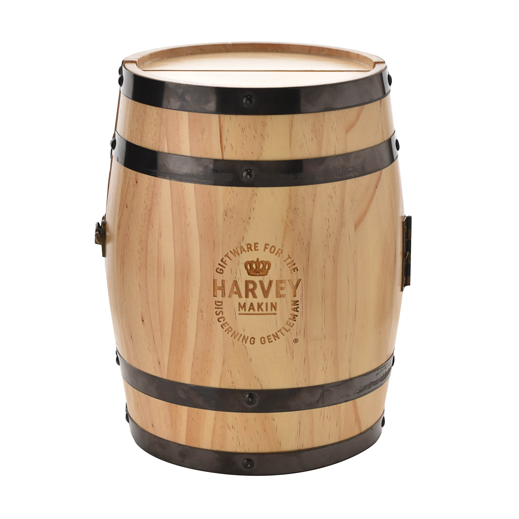 Дървената бъчва е с рустикален вид и се отваря, за да разкрие изработено по поръчка място за съхранение на двете включени чаши за уиски. Бъчвата е завършена с метални детайли и печат „Harvey Makin“, а чашите демонстрират сложни дизайнерски характеристики.