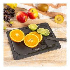Предната част има жлеб за сок, който надеждно улавя течностите. Гладкият гръб е идеален за сервиране на сирене, хляб или антипасти – или може да се използва и за рязане. Дъската не абсорбира миризми на лук и не се обезцветява, лесна е за почистване и остава стабилна на работната повърхност благодарение на плоските си гумени крачета.