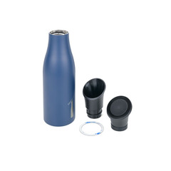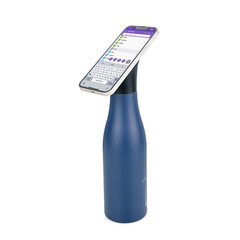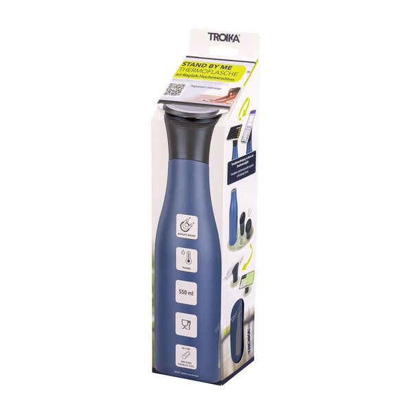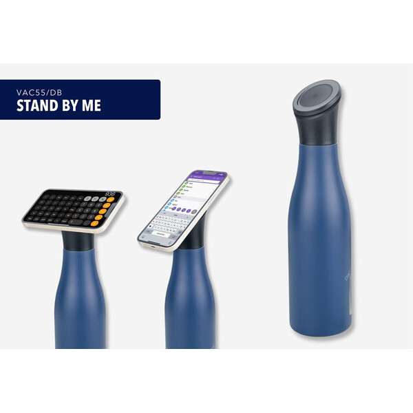 Вакуумна термобутилка с капачка MagSafe, двустенна, вакуумно изолирана, капацитет 550 мл, безопасна за храна, с магнитно, скосено затваряне, което служи като държач за мобилен телефон, допълнителен метален пръстен с лепяща лента 3M за закрепване към всички обикновени смартфони, неръждаема стомана 201 / неръждаема стомана 304 / пластмаса, мат, син