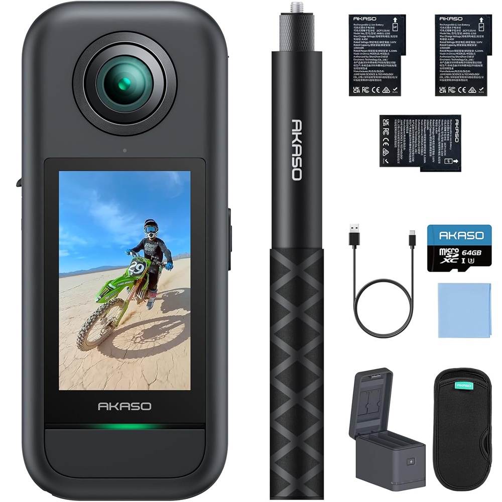 AKASO 360 x1 / Батерия x3 / Многофункционален калъф за зареждане x1 / AKASO Невидим селфи стик x1 / Защитен калъф x1 / USB-C кабел x1 / Кърпичка за обектив x1 / Ръководство за бърз старт x1