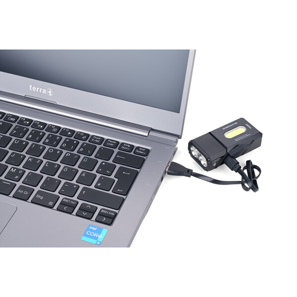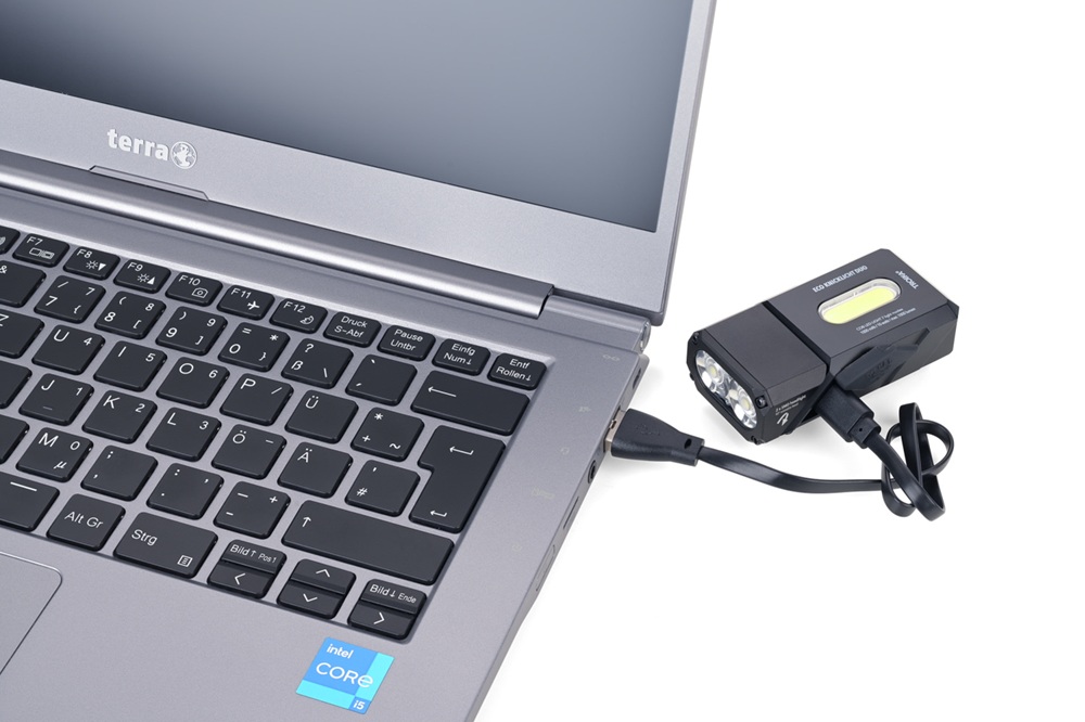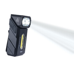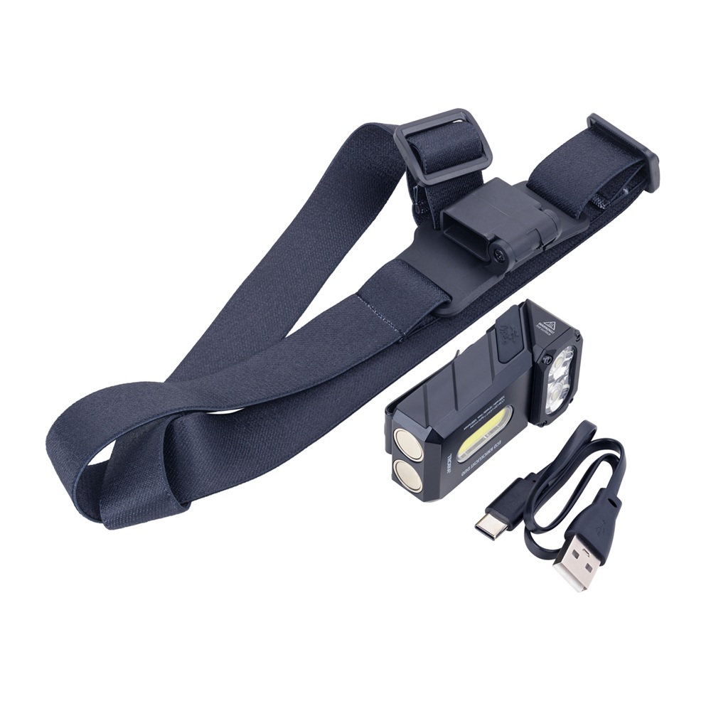 Фенерче/челник, многофункционално и с въртяща се глава: работна/челник, 6 режима на димиране, 2 предни светлини: 100% яркост + 50% яркост, странична COB светлина: 100% яркост, 50% яркост, червена светлина, бързо мигаща червена светлина, режим 1000 лумена за интензивно осветление, с въртяща се глава (до 90°) за оптимално осветление, с 2 силни магнита от долната страна и двойна щипка отзад за закрепване, зарежда се чрез включен USB-C кабел, индикатор за зареждане, включва лента за глава за функцията на челник, 950mAh литиево-йонна батерия, екологично чиста, тъй като се зарежда, ABS, алуминий, черен цвят