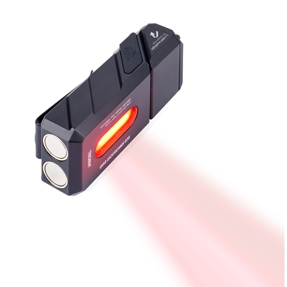 ECO KNICKLICHT DUO съчетава челник, работна светлина и фенерче в едно – с въртяща се глава, два мощни светодиода и гъвкава употреба. Зарежда се чрез USB-C порт. Благодарение на двойното магнитно закрепване, двойната щипка и лентата за глава, свети точно там, където ви е необходимо – на главата, шапката, колана, презрамката на раницата или в работилницата. С до 1000 лумена, седем режима на осветление (включително червена светлина) и функция за димиране, това е вашият експерт по осветление за работа, на открито и ежедневието. Ултракомпактен, здрав, ярък – и винаги с вас.