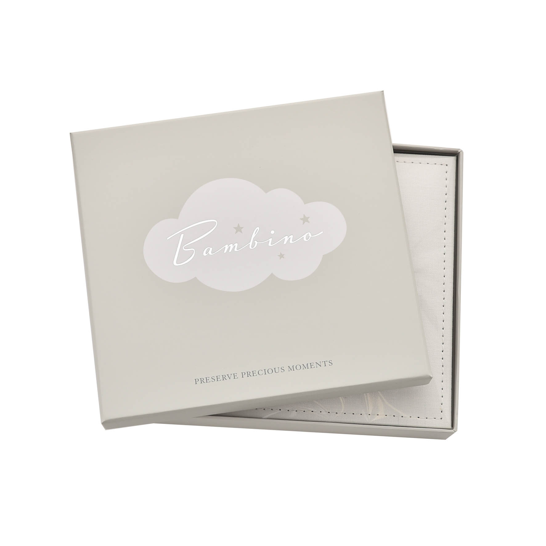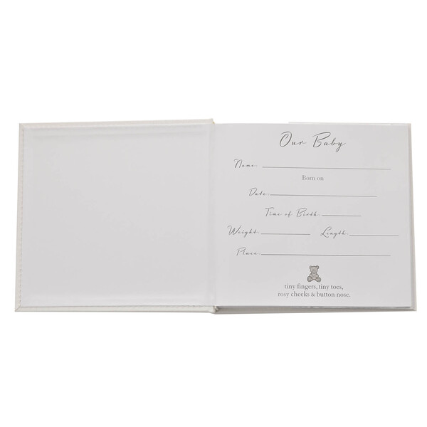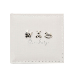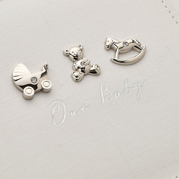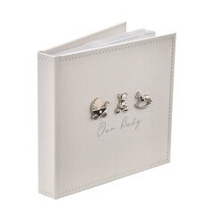 Красивата бяла ленена корица е с тъкан завършек – украсена с инкрустирани с кристали посребрени фигурки на плюшено мече, количка и люлеещо се конче – допълнена с стикер „Нашето бебе“ със сребърни букви. Вътре има място за сто снимки и персонализирана първа страница, на която да се отбележат подробности за новороденото в семейството.