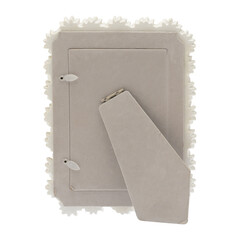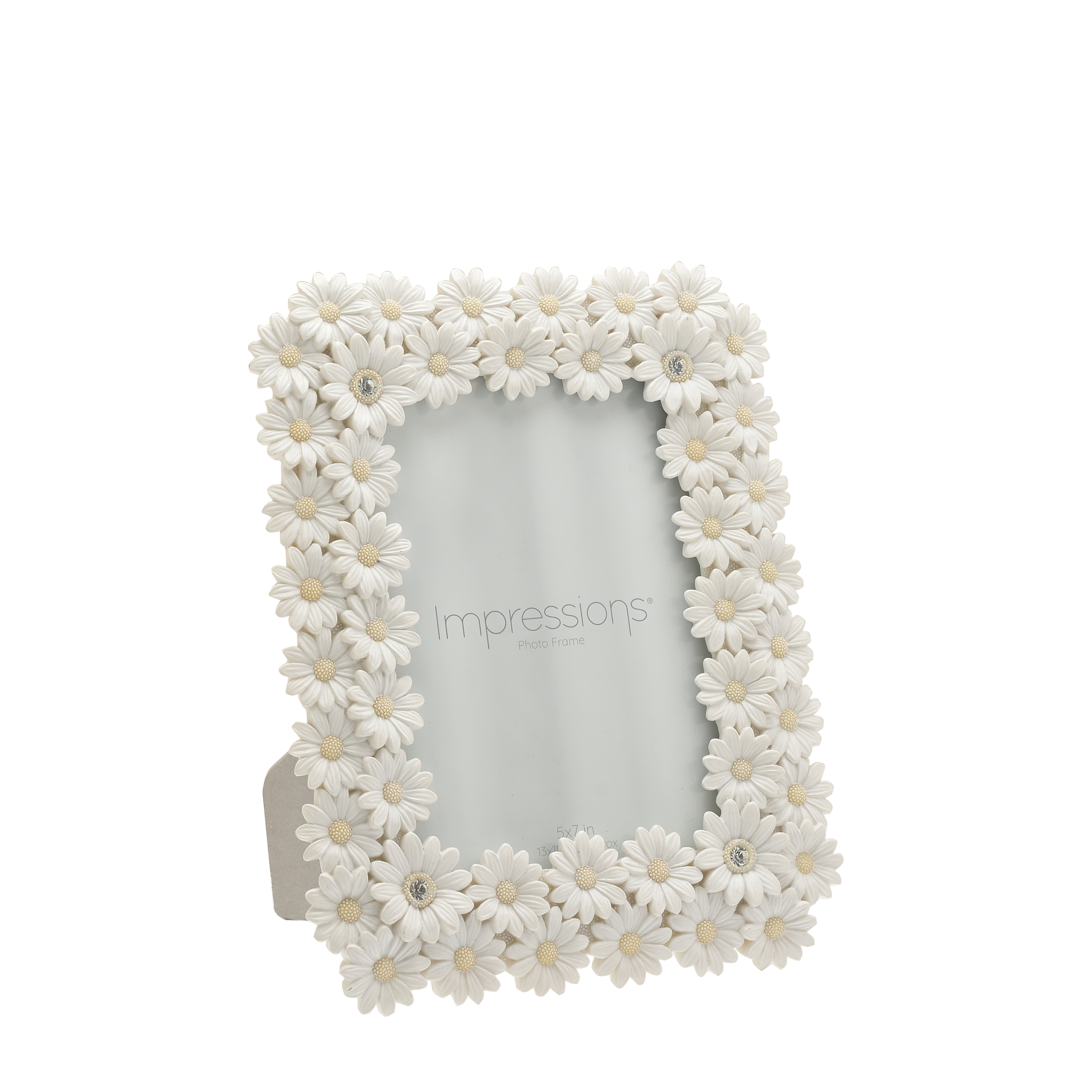 Красива бяла рамка за снимки от полирезин с маргаритки 12,7 см x 18,8 см от IMPRESSIONS® by Juliana. Украсена с нежни бели маргаритки с кристални орнаменти, създаващи свежа и уникална естетика. Идеална за показване на скъпи снимки на приятели, семейство и близки. Допълнена със сива кадифена подпора. Основен материал: Полирезин Основен цвят: Бял Размер на отвора: 5” x 7” (13 x 18 см) Брой отвори: Единичен Ориентация: Пейзажна/Портретна Форма на отвора: Правоъгълна Размери на опаковката: В 260, Ш 210, Д 30 мм Размери на продукта: В 260, Ш 200, Д 25 мм Тегло на продукта: 0.6180 кг
