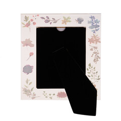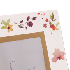 Прозрачната стъклена фоторамка е с лъскаво покритие, допълнено с цветни щампи на цветя и златна рамка около централния отвор. Предназначена е за портретно или пейзажно излагане с помощта на прикрепената подпора.