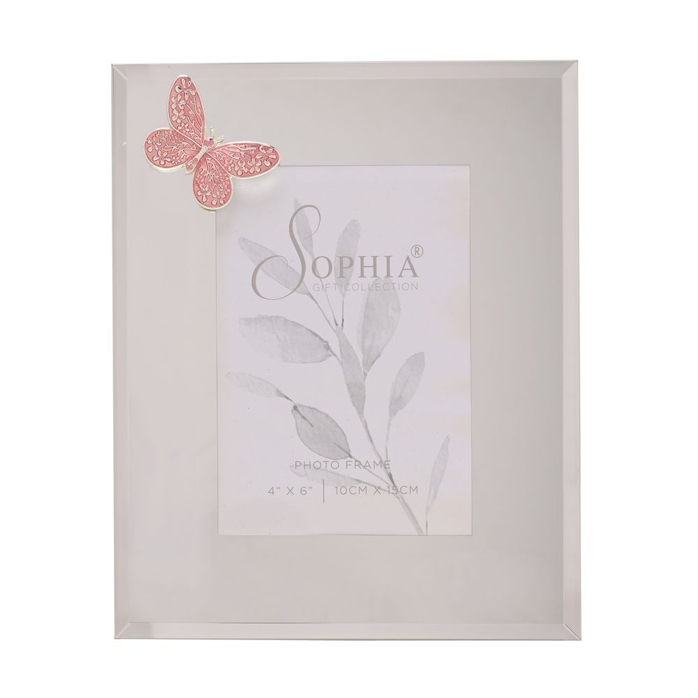 Стъклена фоторамка с розова пеперуда от SOPHIA® - домът на изтънчеността в дамските подаръци. Зашеметяващ, но семпъл артикул за любителите на красотата. Има огледално покритие, което я прави естетически привлекателна. Красотата на пеперудата е в основата на популярността на тази рамка. Предлага се опакована в кафява затворена кутия. Марка: Sophia® Тегло на продукта: 0.4720 кг Размери на продукта: В 227, Ш 16, Д 177 мм Основен материал: Стъкло Вторичен материал: Метална сплав Брой отвори: Единичен Ориентация: Портретна Форма на отвора: Правоъгълна Основно покритие: Огледално Размер на отвора: 4” x 6” (10 x 15 см)