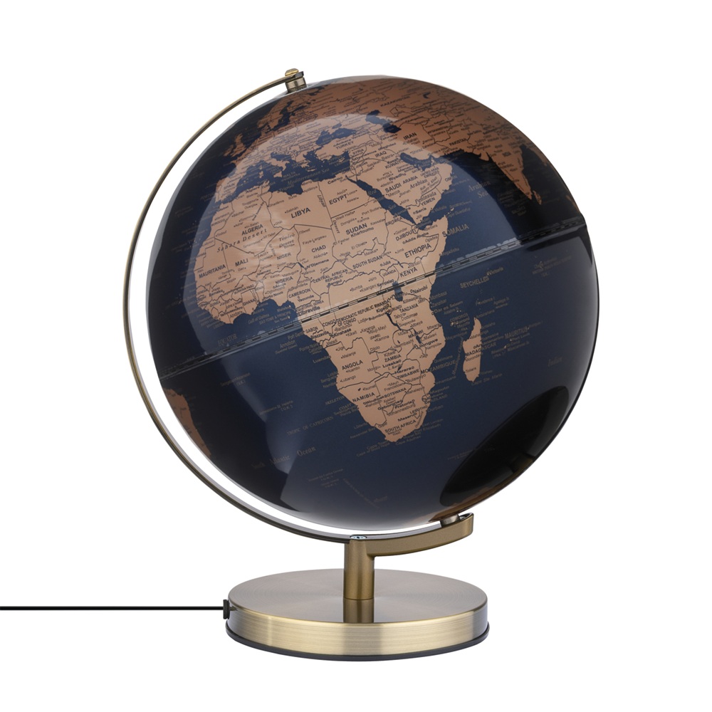 Глобус с диаметър 30 см, вградено осветление с 3 нива на яркост чрез сензорна функция, включва захранващ адаптер с GaN и технология за бързо зареждане Power Delivery, 20W с USB-C и USB-A порт, антично златиста метална основа, релефна карта, подвижна ос, метал, пластмаса, мат, бронзов цвят/тъмносин