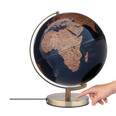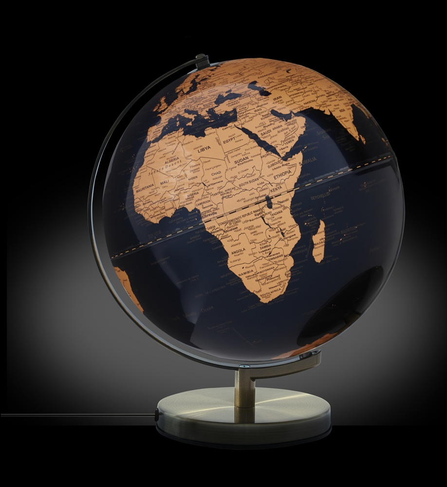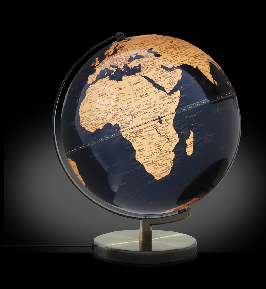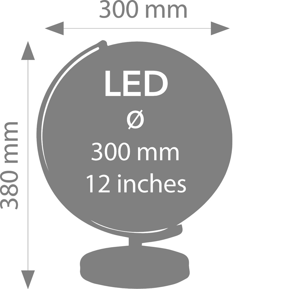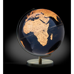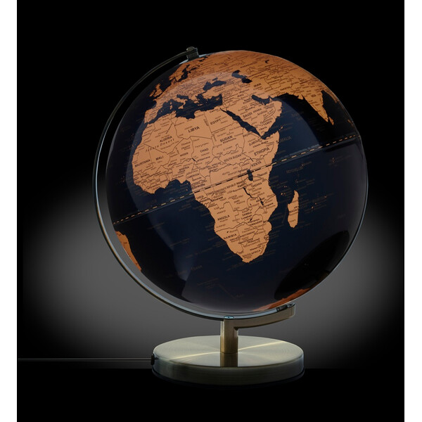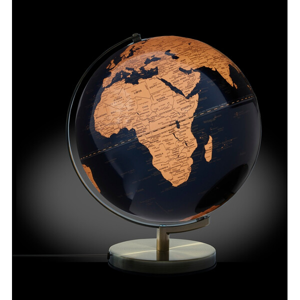 Атрактивен дизайн: Матов STELLAR LIGHT TOUCH LED глобус (диаметър 30 см) с осветено изображение на картата. Бронзово оцветените континенти и тъмносините морета създават завладяващ контраст. Картата е обозначена на английски език с информация за континенти, държави, океани, географски зони, важни градове и планини. Планините са осезаемо подчертани на повърхността.