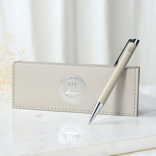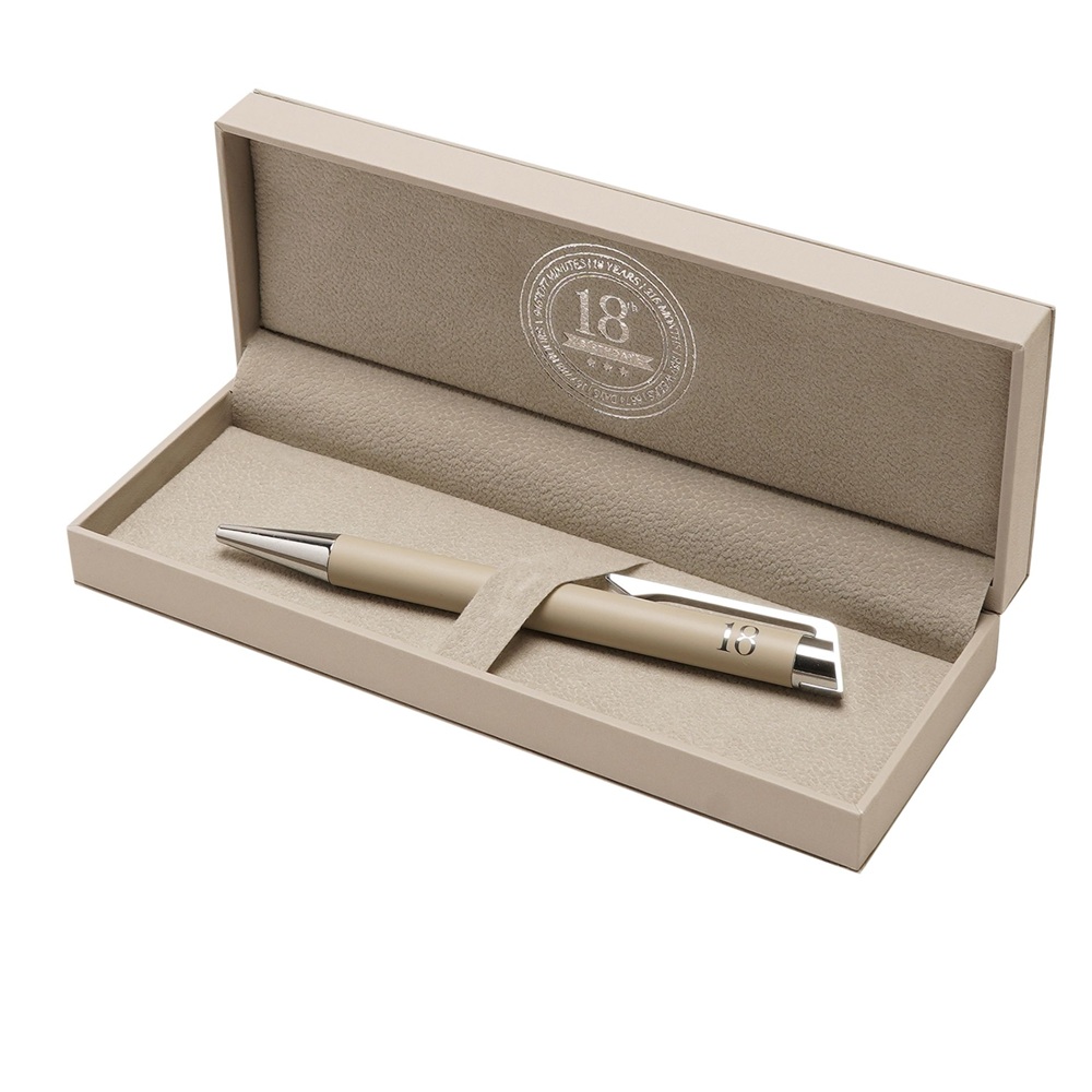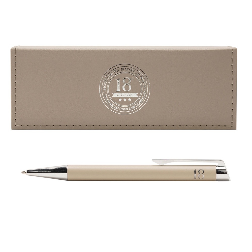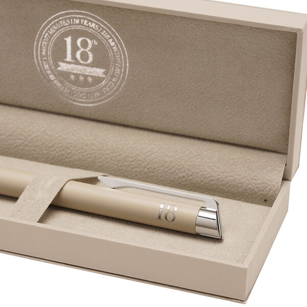 Тази бежова химикалка е представена в подаръчен калъф, с релефен кръгъл печат с числото 18 за ясно съобщение за възрастта и силна привлекателност. Неутралната цветова палитра и изчистеният завършек я правят подходяща както за мъже, така и за жени, идеална за подаръци за рожден ден и колекции, свързани с възрастта.
