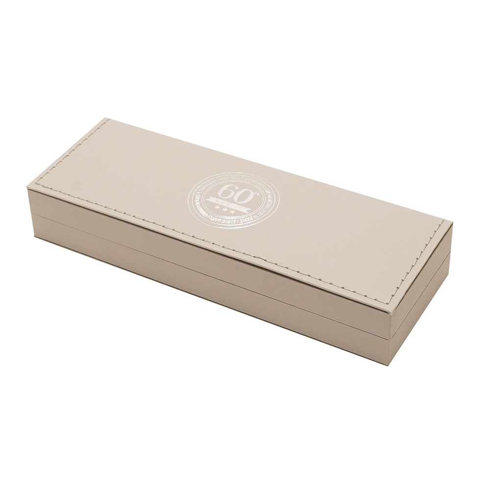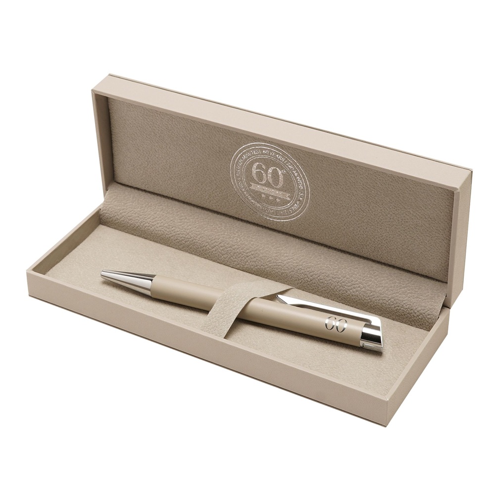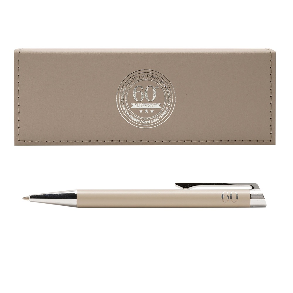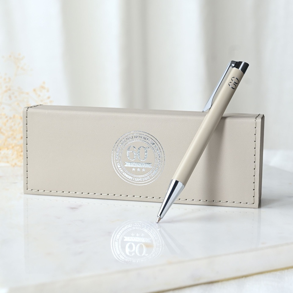 Тази бежова химикалка е представена в подаръчен калъф, с релефен кръгъл печат с числото 60 за ясно съобщение за възрастта и силна привлекателност. Неутралната цветова палитра и изчистеният завършек я правят подходяща както за мъже, така и за жени, идеална за подаръци за рожден ден и колекции, свързани с възрастта.