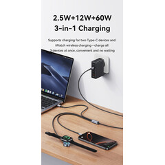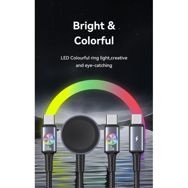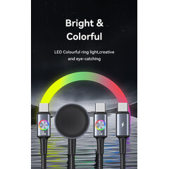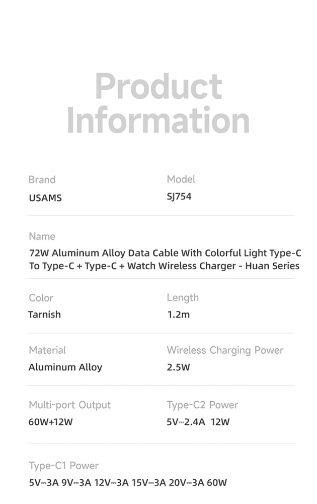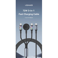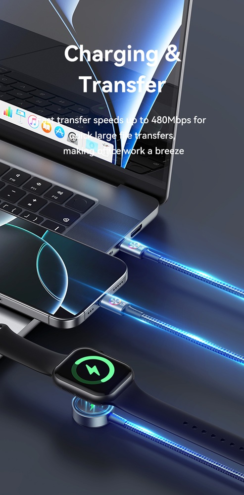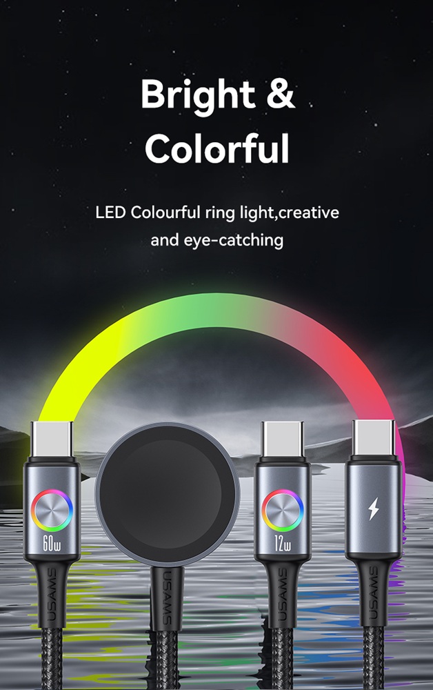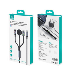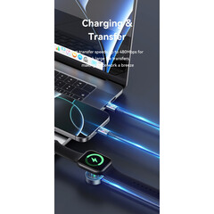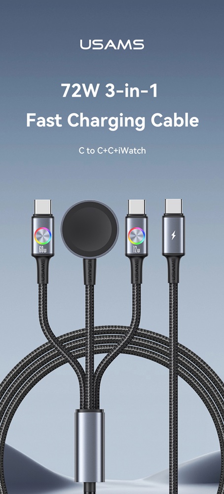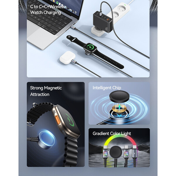 Материал: Алуминиева сплав Цвят: Черен Дължина на кабела: 1 м Мощност/Ток: 72 W/3 A Входен интерфейс: Type-C Изходен интерфейс: Type-C+Type-C+iWatch Пренос на данни: Поддържа Съвместими устройства: Смартфони, таблети, лаптопи Характеристики: 1. 3-в-1 зареждане: Поддържа едновременно зареждане на две Type-C устройства и безжично зареждане на iWatch, осигурявайки обща изходна мощност от 72 W. 2. Високоскоростно зареждане: Калайдисаната медна сърцевина осигурява стабилна проводимост, позволявайки мигновен 3A токов скок за бързо зареждане. 3. Силна магнитна връзка: Зарядното устройство за часовник автоматично се закрепва здраво, когато се донесе до задната част на iWatch. 4. Интелигентна чип технология: Осигурява оптимални токови изходи въз основа на нуждите на устройството, осигурявайки безопасно и стабилно зареждане без повреда на батерията. 5. Градиентни LED пръстеновидни светлини: Привличащ вниманието и креативен дизайн за визуална естетика, показващ състоянието на зареждане. 6. Премиум изработка: Конектори от неръждаема стомана с антиокислителна обвивка от алуминиева сплав, съчетани с високоякостно оплетен найлонов кабел.