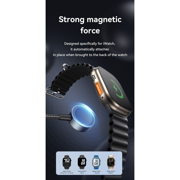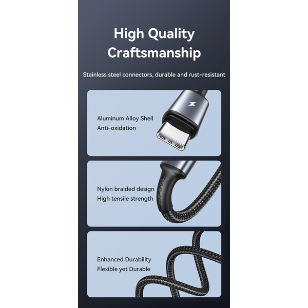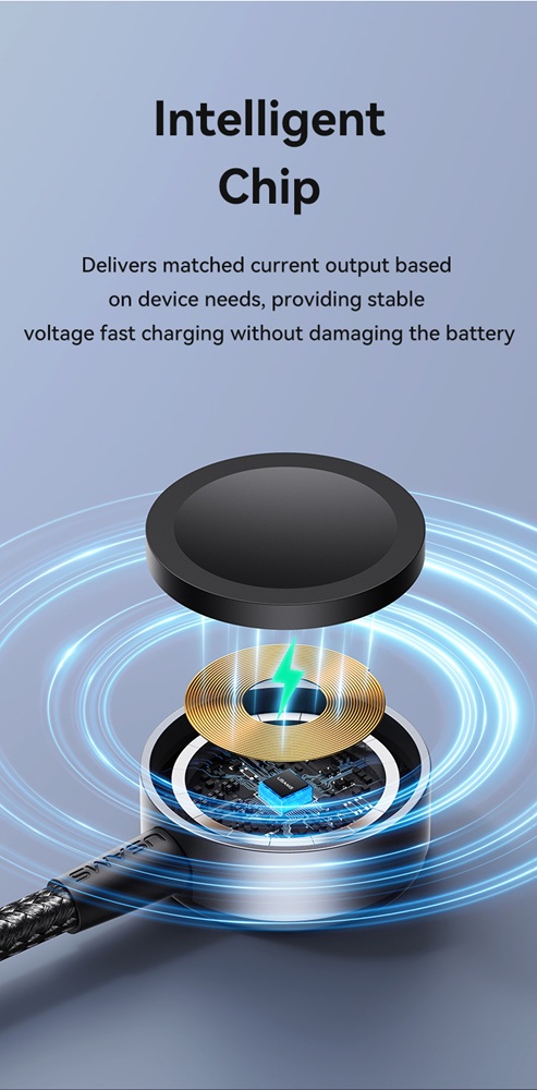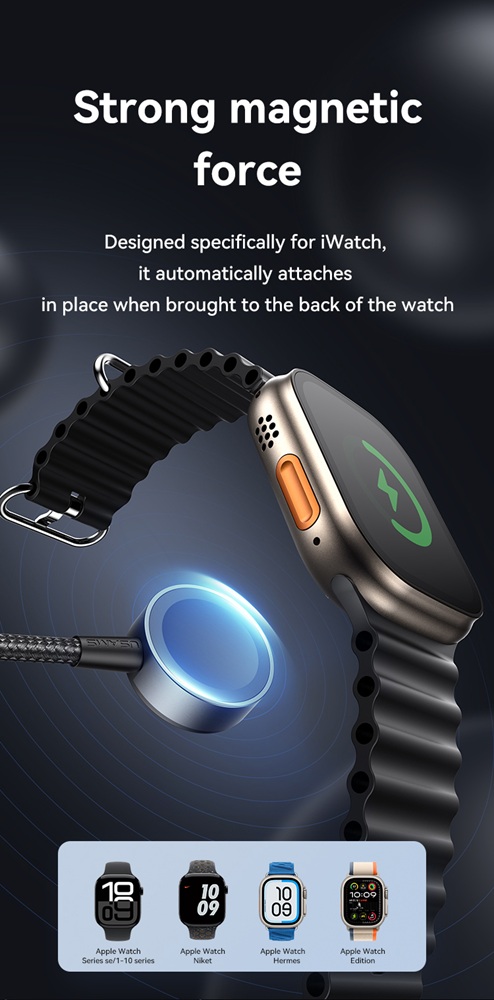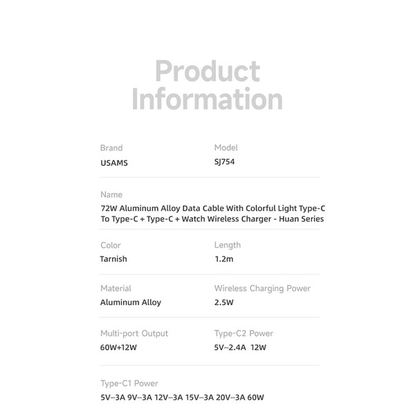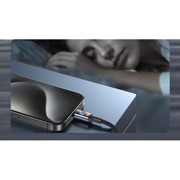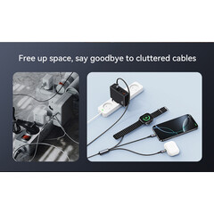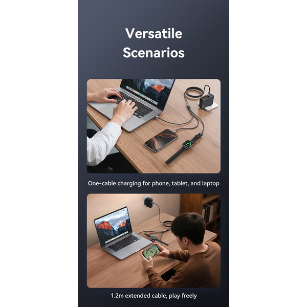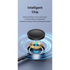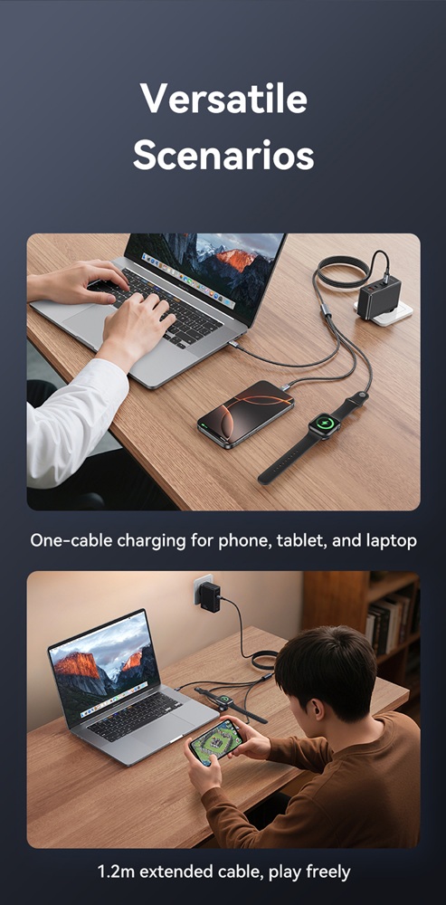 Материал: Алуминиева сплав Цвят: Черен Дължина на кабела: 1 м Мощност/Ток: 72 W/3 A Входен интерфейс: Type-C Изходен интерфейс: Type-C+Type-C+iWatch Пренос на данни: Поддържа Съвместими устройства: Смартфони, таблети, лаптопи Характеристики: 1. 3-в-1 зареждане: Поддържа едновременно зареждане на две Type-C устройства и безжично зареждане на iWatch, осигурявайки обща изходна мощност от 72 W. 2. Високоскоростно зареждане: Калайдисаната медна сърцевина осигурява стабилна проводимост, позволявайки мигновен 3A токов скок за бързо зареждане. 3. Силна магнитна връзка: Зарядното устройство за часовник автоматично се закрепва здраво, когато се донесе до задната част на iWatch. 4. Интелигентна чип технология: Осигурява оптимални токови изходи въз основа на нуждите на устройството, осигурявайки безопасно и стабилно зареждане без повреда на батерията. 5. Градиентни LED пръстеновидни светлини: Привличащ вниманието и креативен дизайн за визуална естетика, показващ състоянието на зареждане. 6. Премиум изработка: Конектори от неръждаема стомана с антиокислителна обвивка от алуминиева сплав, съчетани с високоякостно оплетен найлонов кабел.