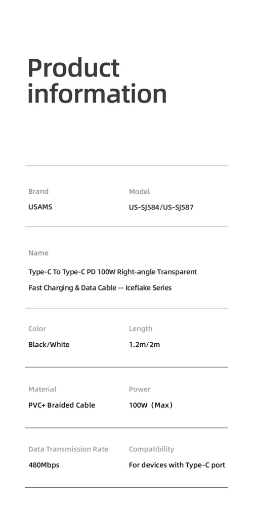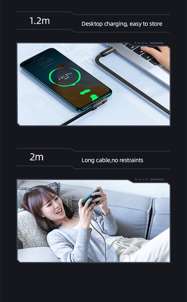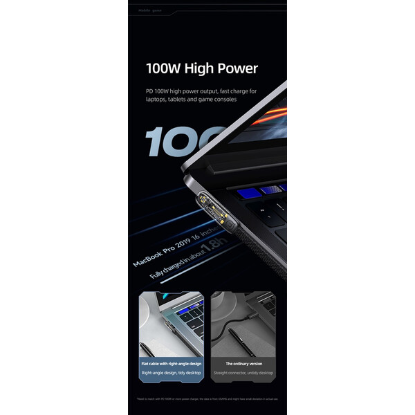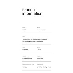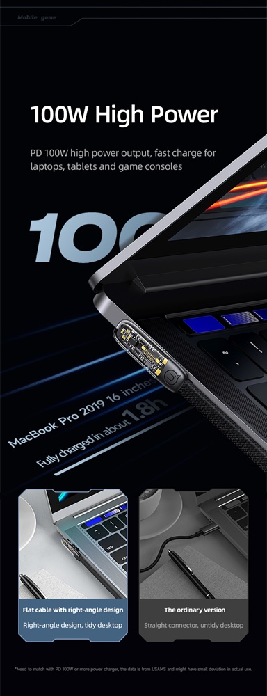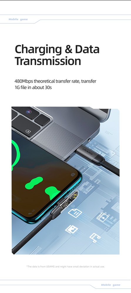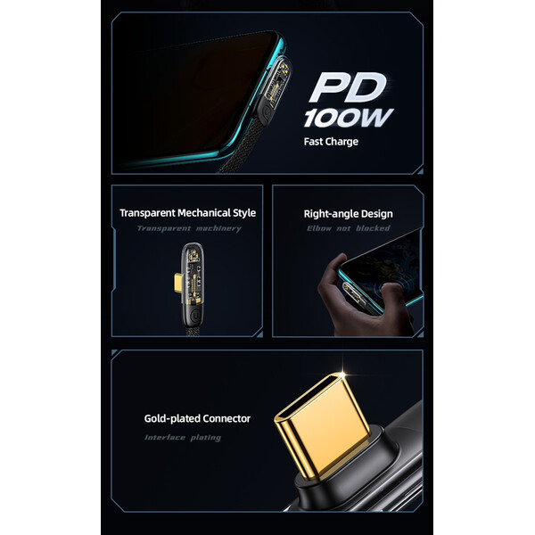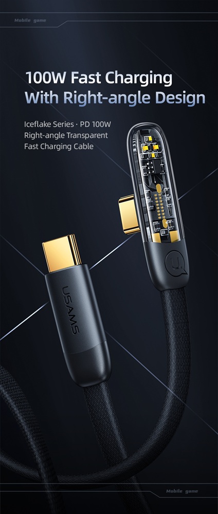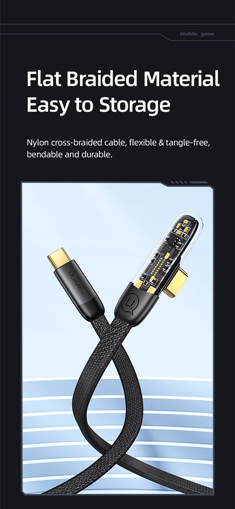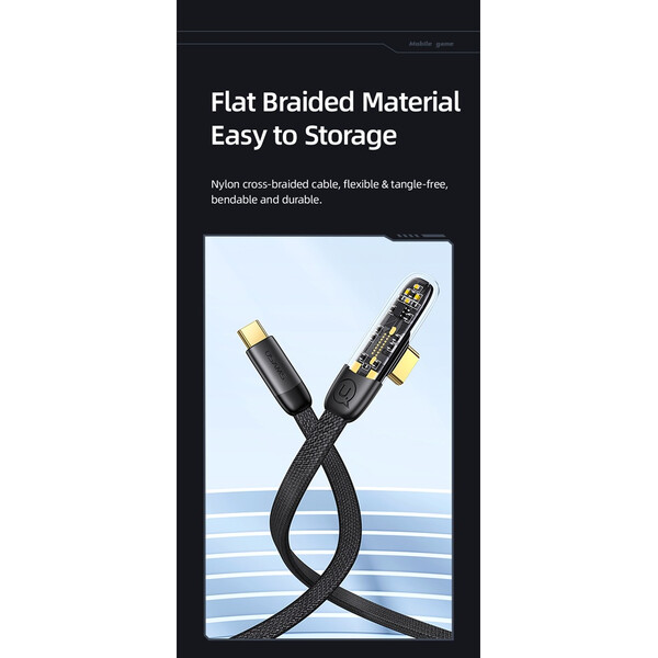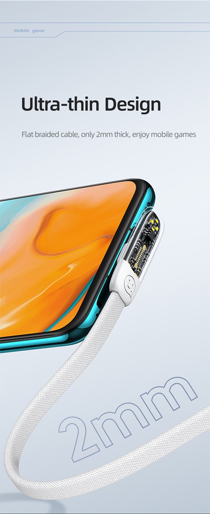 1. Материал на продукта: PVC + оплетка 2. Изходна мощност: 100W 3. Плоска оплетка, устойчива на огъване и по-удобна за хващане 4. Прозрачен дизайн и ъгъл под 90 градуса на единия край, удобен при игра 5. Позлатен интерфейс за зареждане, подобрена антиокислителна защита, дълготрайна употреба като нов 6. Зареждане и трансфер "две в едно“, скорост на предаване на данни до 480Mbps