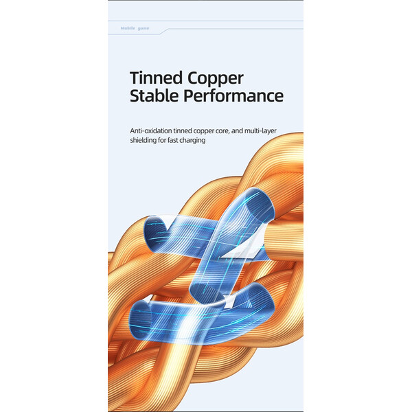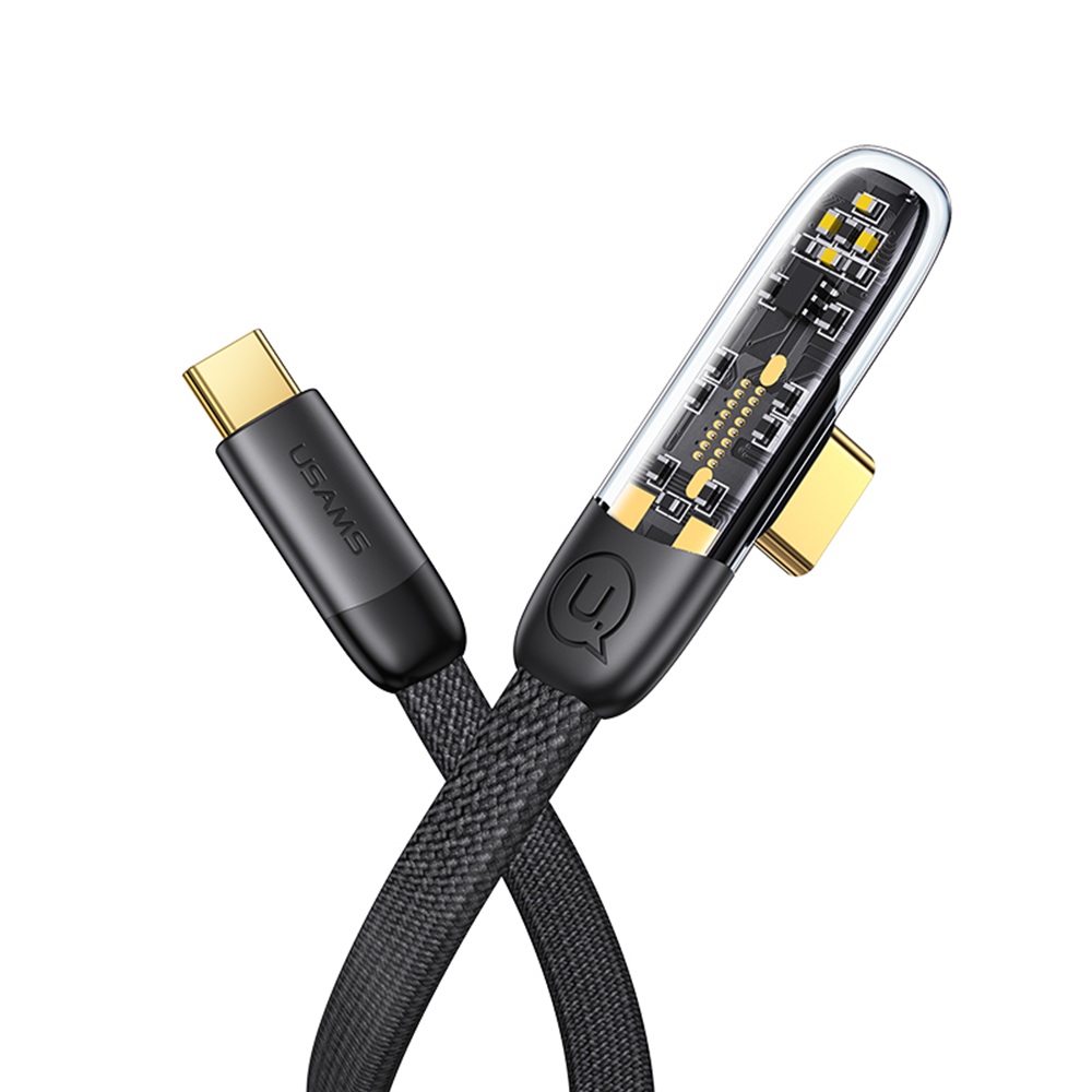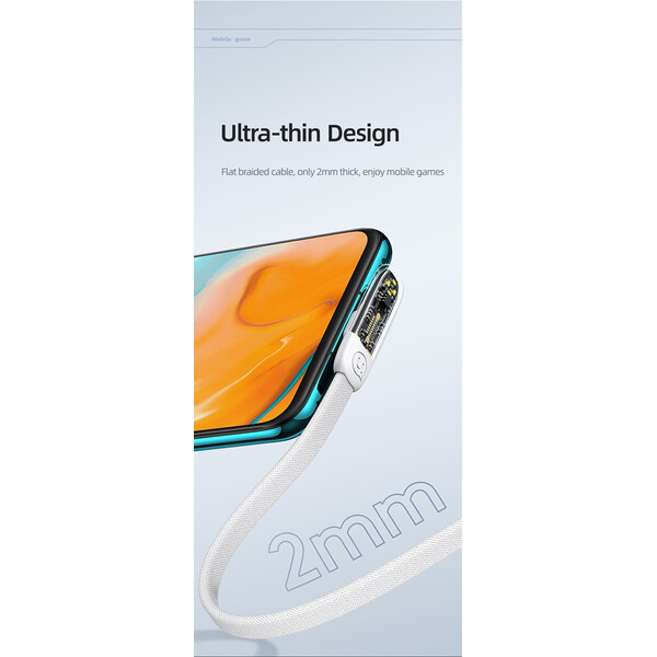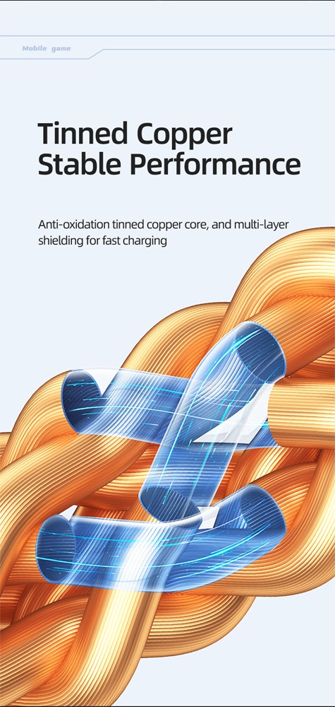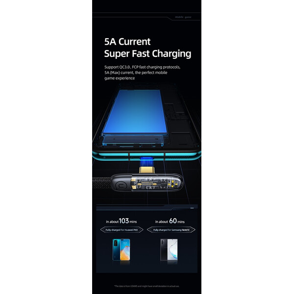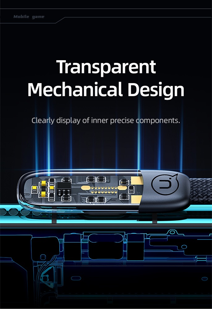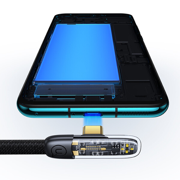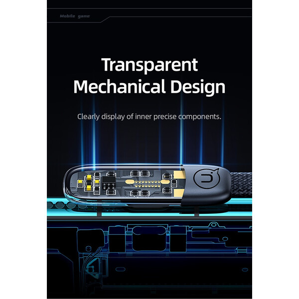 1. Материал на продукта: PVC + оплетка 2. Изходна мощност: 100W 3. Плоска оплетка, устойчива на огъване и по-удобна за хващане 4. Прозрачен дизайн и ъгъл под 90 градуса на единия край, удобен при игра 5. Позлатен интерфейс за зареждане, подобрена антиокислителна защита, дълготрайна употреба като нов 6. Зареждане и трансфер "две в едно“, скорост на предаване на данни до 480Mbps