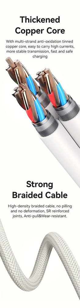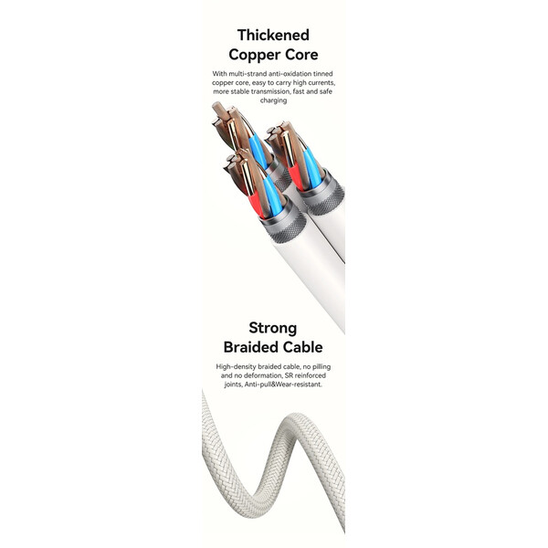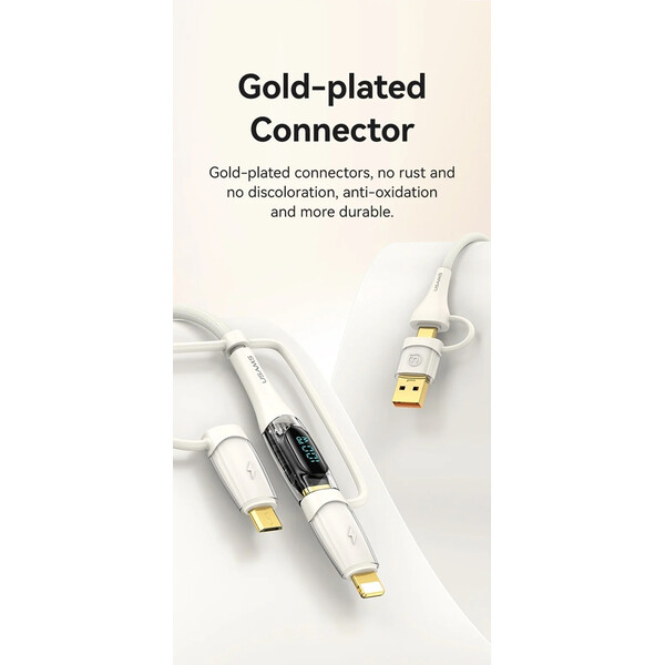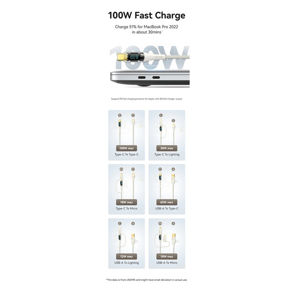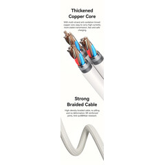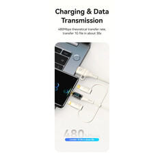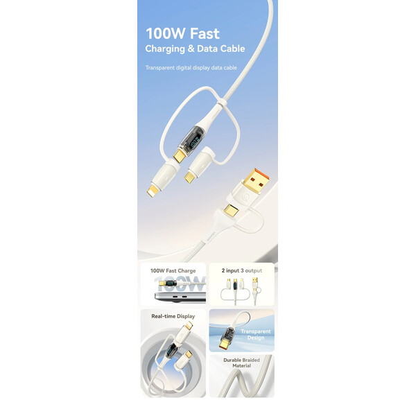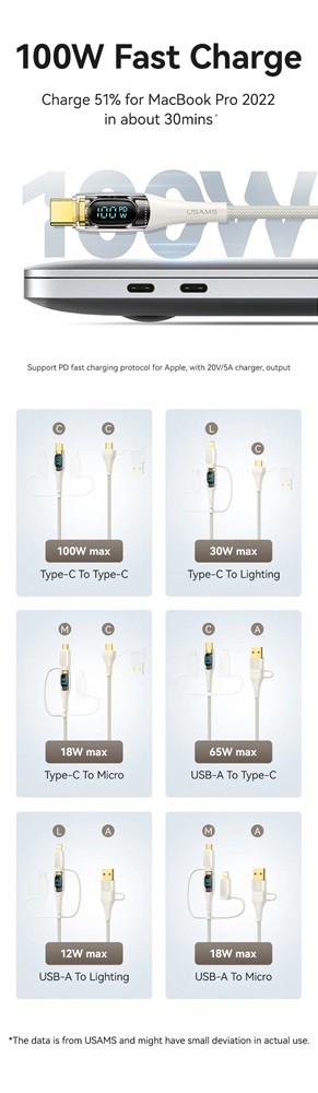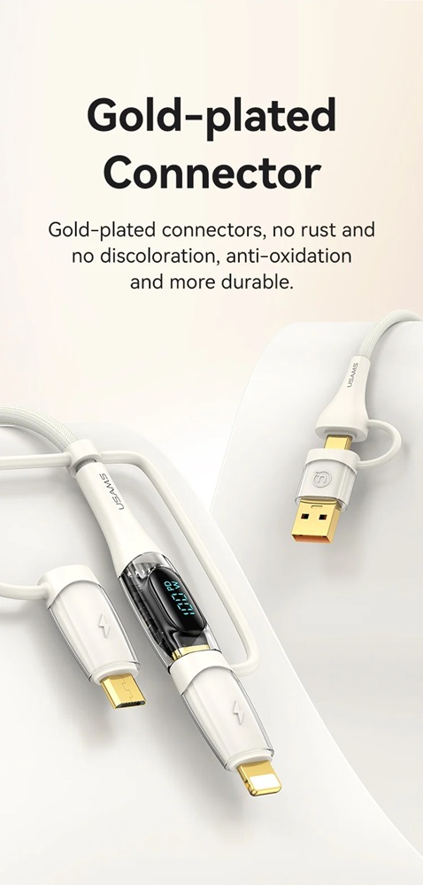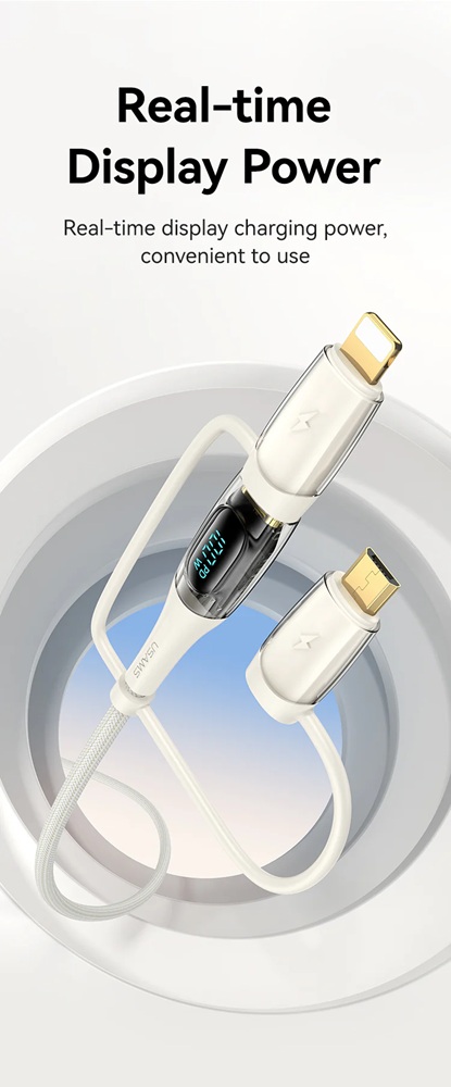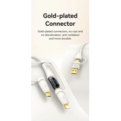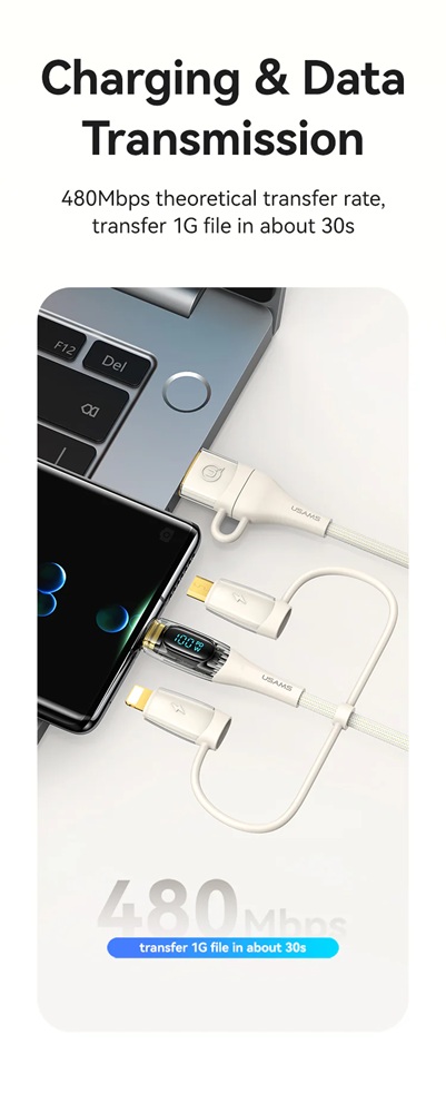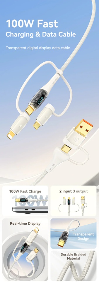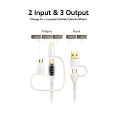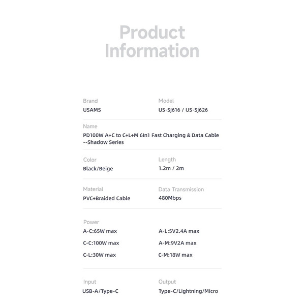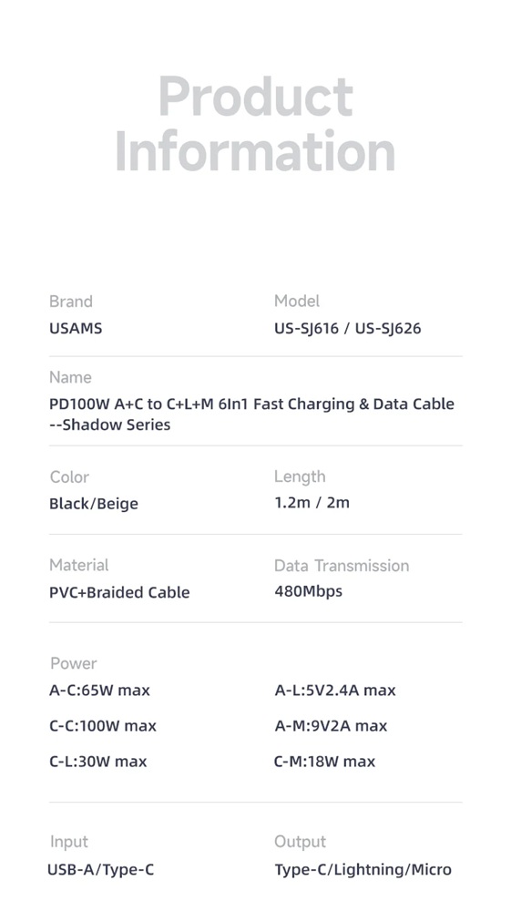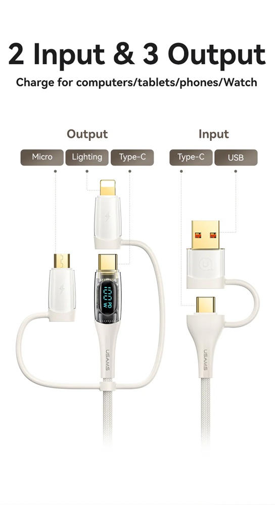 Кабелът US-SJ626 PD100W A+C към C+L+M 6-в-1 за бързо зареждане и данни от серията Shadow на Usams е универсален и мощен USB кабел, подходящ за различни устройства. С дължина от 2 метра, той осигурява достатъчно място за употреба, а издръжливият PVC и оплетен материал гарантират дълготрайност. Този кабел поддържа впечатляваща мощност на зареждане до 100 W и позволява бързи скорости на пренос на данни до 480 Mbps. Иновативният 6-в-1 дизайн позволява едновременно зареждане и пренос на данни за различни типове устройства, включително USB-A, Type-C, Lightning и Micro-USB. Прозрачният дизайн на кабела показва текущата мощност на зареждане в реално време, което е практична функция за потребители, които искат да следят напредъка на зареждането. 100W кабел за бързо зареждане и данни Прозрачен цифров дисплей 2 входа, 3 изхода Дисплей в реално време Издръжлив плетен материал Изход - Micro + iP + Type-C Вход Type-C + USB Поддръжка на протокол за бързо зареждане PD Type-C към Type-C 100W макс. Type-C към iP 30W макс. Type-C към Micro 18W макс. USB-A към Type-C 65W макс. USB-A към iP 12W макс. USB-A към Micro 18W макс. Дисплей в реално време, мощност на зареждане Удобен за употреба Задоволява повечето нужди от зареждане Позлатен конектор Удебелена медна сърцевина Здрав плетен кабел Материал: PVC + плетен кабел Пренос на данни 480Mbps