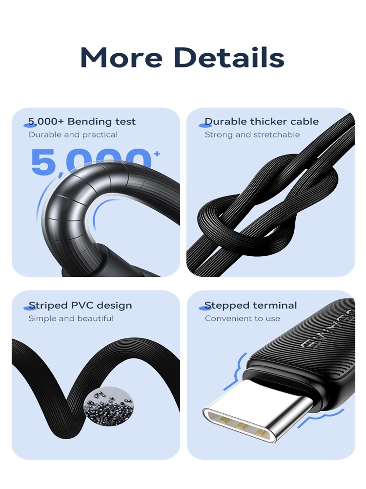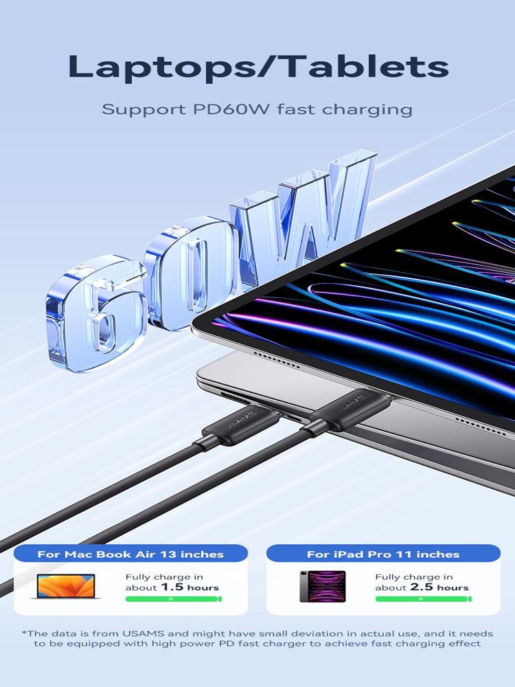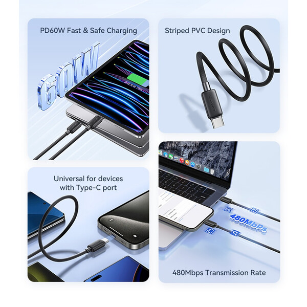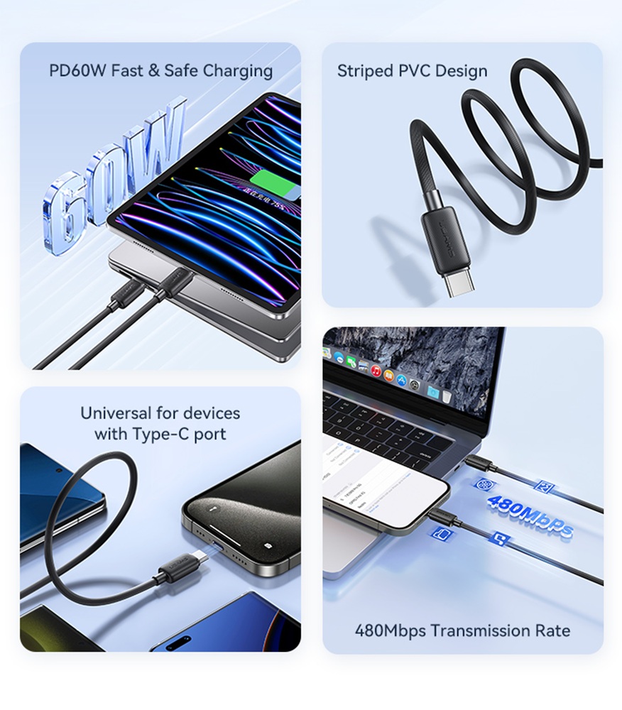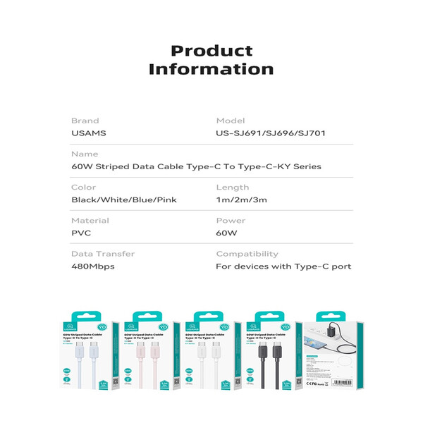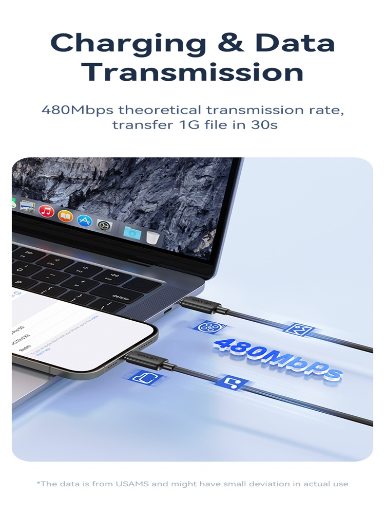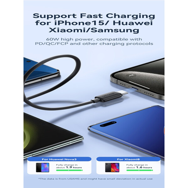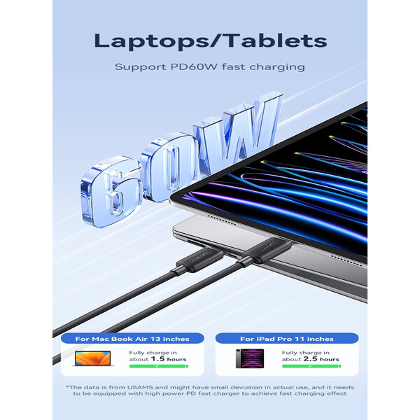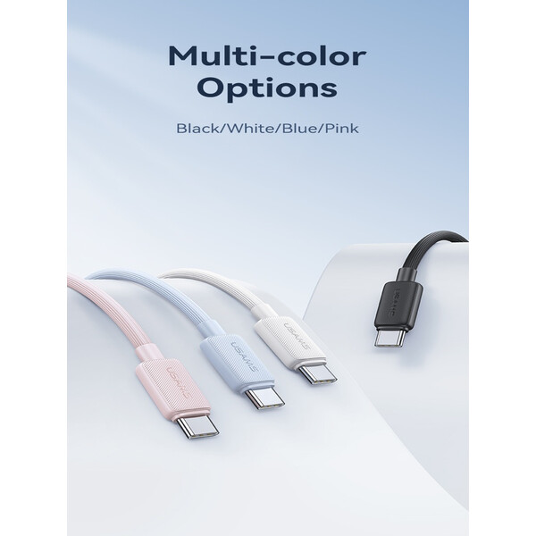 USB-C към USB-C кабел за зареждане и пренос на данни от Usams. Акценти на продукта: Зареждане с мощност до 60 W Поддръжка на пренос на данни Здрав, гъвкав кабел, който не се заплита Технически характеристики: Конектор 1: USB-C мъжки Конектор 2: USB-C мъжки Изходна мощност: 60 W (макс.) Скорост на пренос на данни: 480 Mbps Дължина на кабела: 1 м Материал: PVC