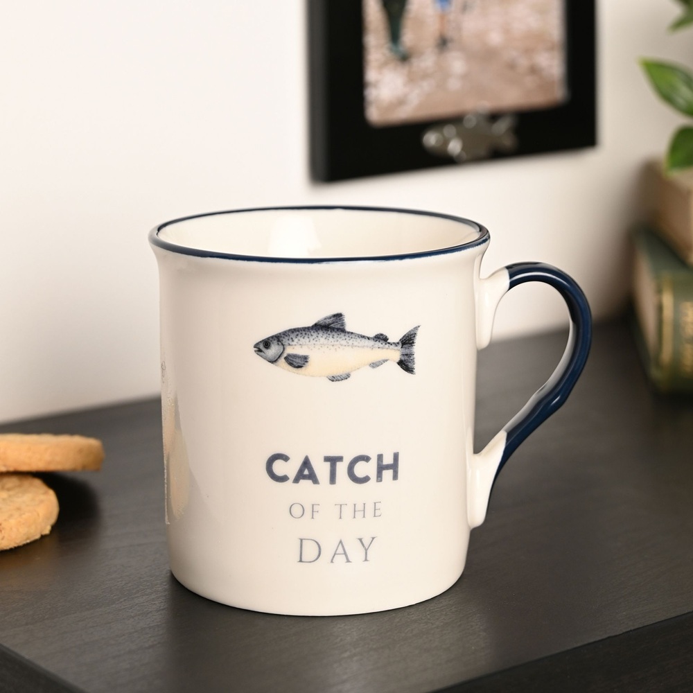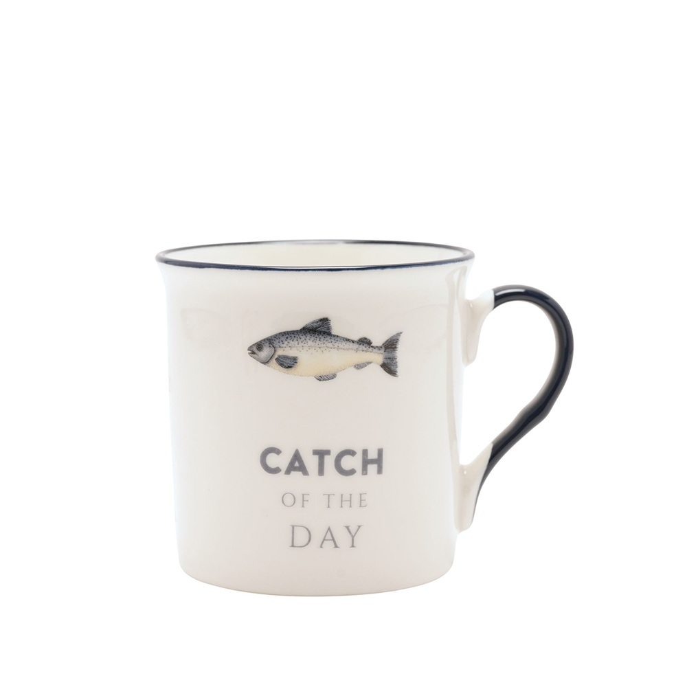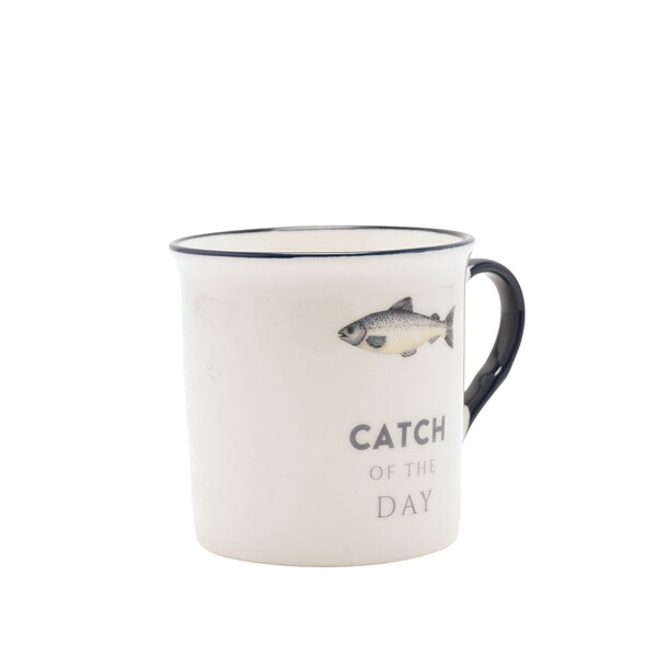 Бяла керамична чаша със силует на риба и надпис "УЛОВ НА ДЕНЯ". Марка: Harvey Makin® Тегло на продукта: 0.2380 кг Размери на продукта: В 86, Ш 115, Д 86 мм Размери на опаковката: В 92, Ш 92, Д 106 мм