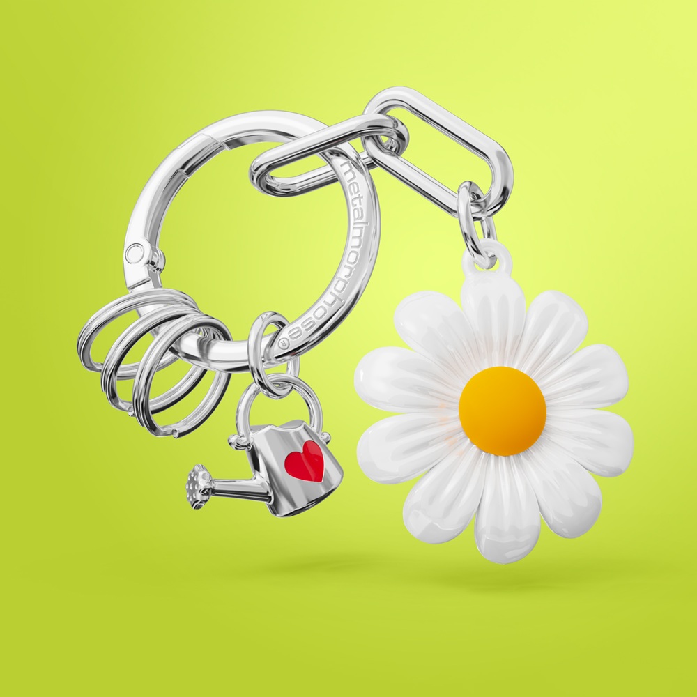 Материал: Ключодържател / Висулка за чанта от цинкова сплав Бяла боя, матово жълто силиконово цвете, лъскав хром и червено епоксидно покритие във формата на лейка Опаковка: Векторна кутия Цитат на опаковката: В свят, пълен с цветя, бъди маргаритка