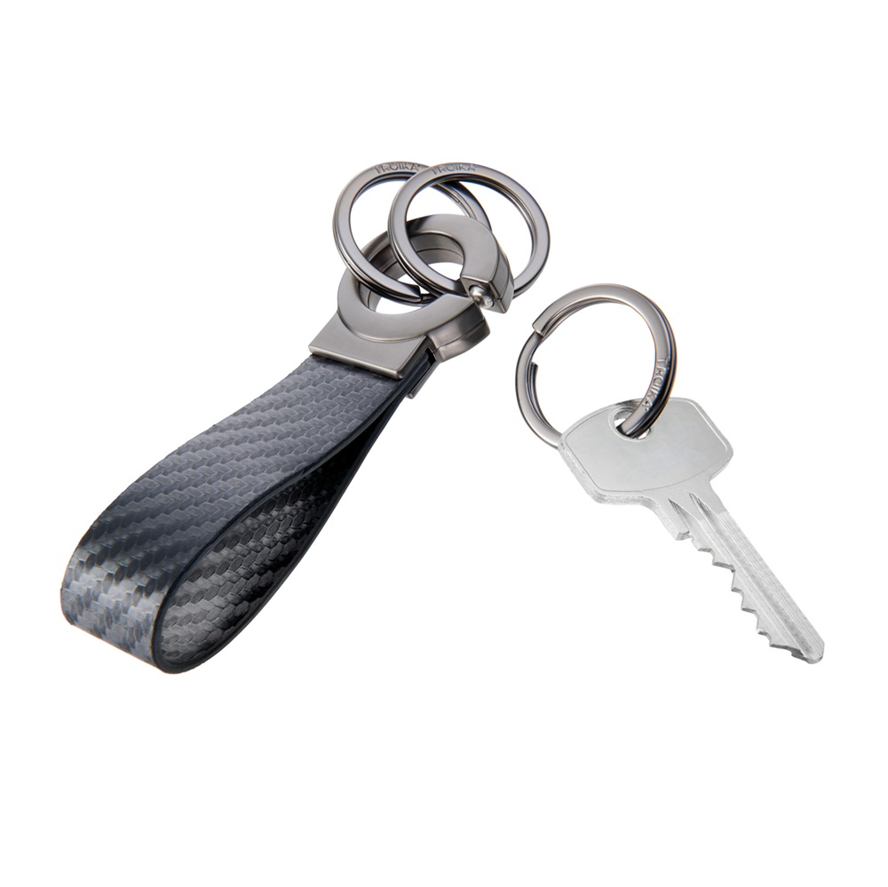 Ключодържател с практично закопчаване „клик“, каишка от изкуствена кожа с карбонов вид, с 3 ключодържателя, метал, полиуретан, хромиран, матов, карбонов вид