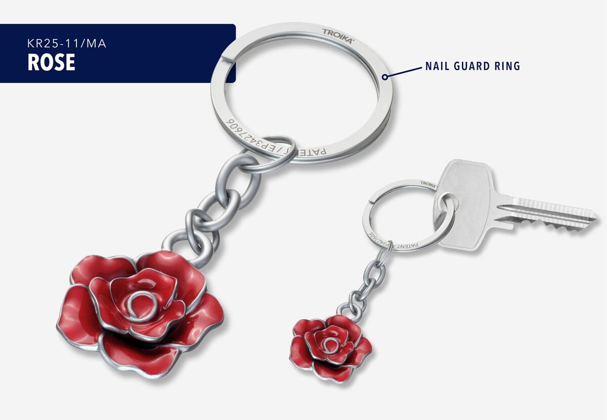 Ключодържател във формата на цвете – в истински 3D дизайн на роза. Елегантен, женствен и функционален. С патентованата система NAIL GUARD на TROIKA за бърза и лесна смяна на ключове. Изработен от метална отливка, матово хромиран, в червено и сребристо с емайлирани детайли. Красив като роза – и практичен като TROIKA. Ключодържател, цвете, бързо и лесно закрепване на ключовете благодарение на патентования механизъм за отваряне (TROIKA NAIL GUARD), лят метал/емайл, матов, цвят червен/сребрист. Размери: 80 x 30 x 8 мм Тегло: 12 гр