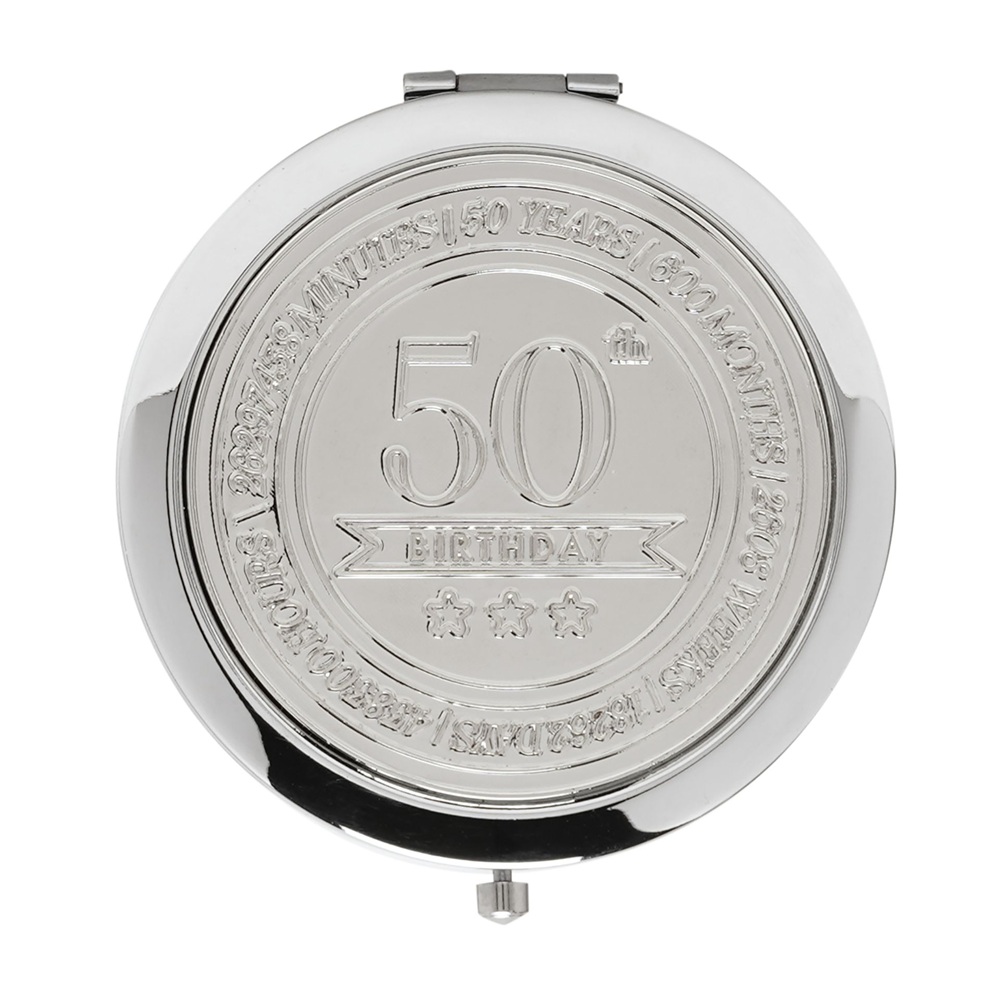 С полиран сребрист екстериор, компактното огледало е с релефен печат за 50-годишнина на капака за незабавно разпознаване на повода. Тънкият му, преносим дизайн го прави подходящ за носене в чанта или за пътуване, предлагайки силна привлекателност за пазаруване като подарък за рожден ден, специфичен за възрастта.