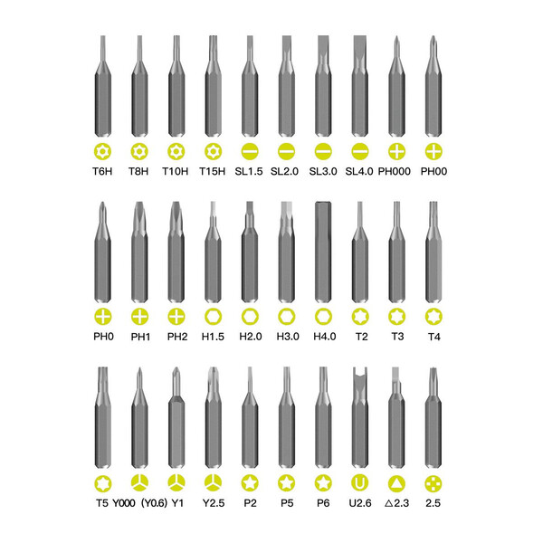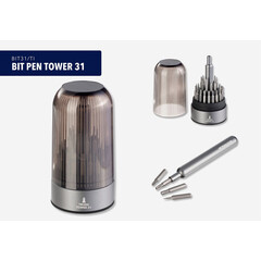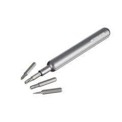 Стилен мини инструмент с максимален ефект. 30 прецизни бита, изработени от хром-ванадиева стомана, плюс магнитен държач за битове – всички спретнато съхранявани в компактна алуминиева кула. Неплъзгащата се силиконова основа осигурява захват и стабилност. Идеален за бързи домашни ремонти: кухненски везни, дистанционни управления, LED светлинни вериги и други. Дизайнът среща функцията – ремонтирайте, не сменяйте.