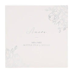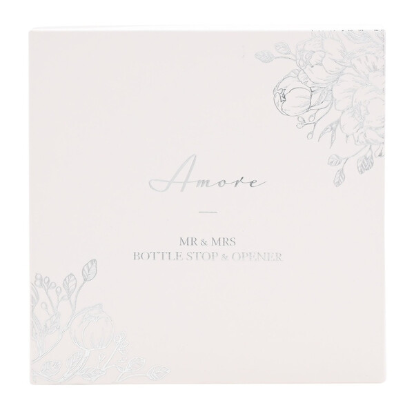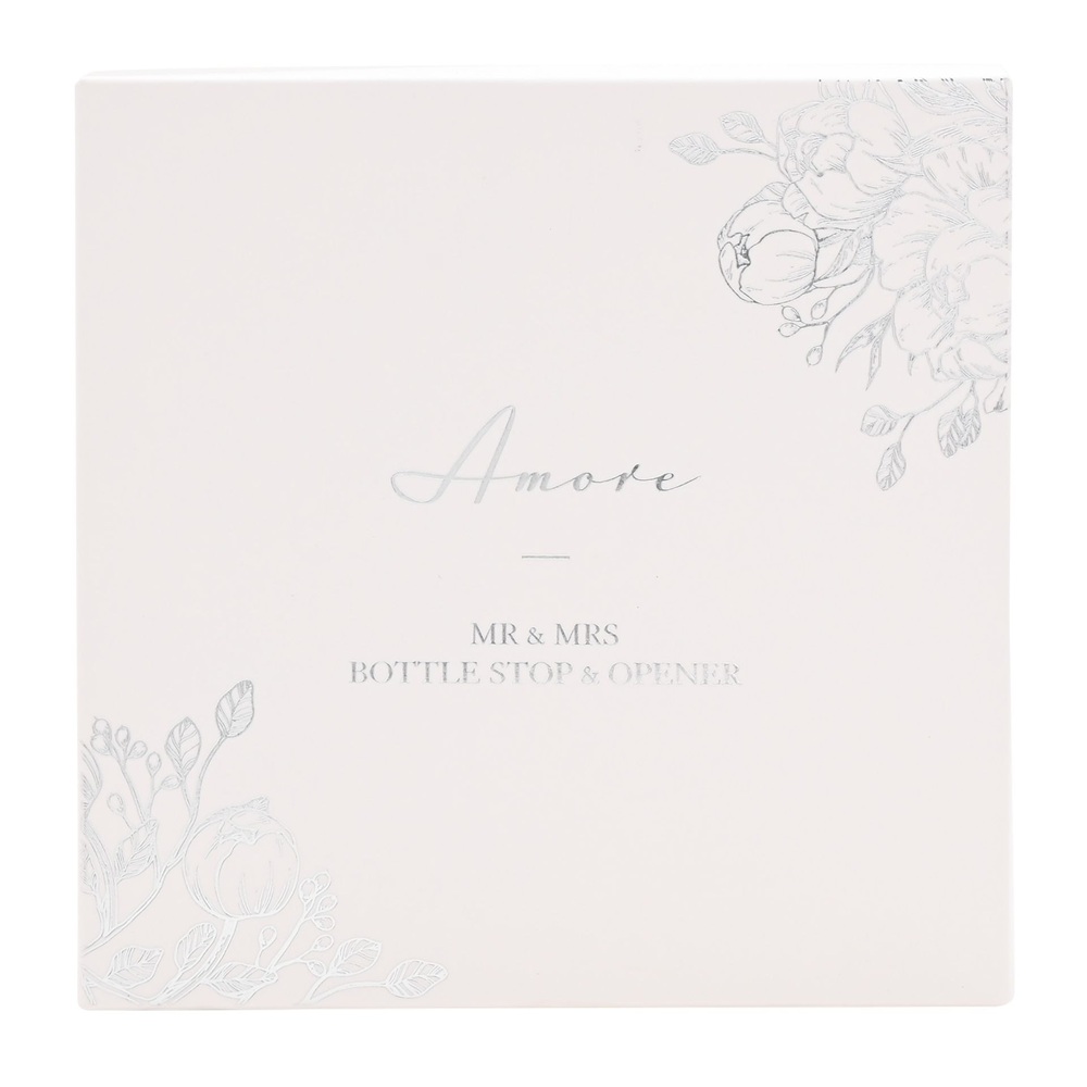 Очарователен комплект отварачка и тапа за бутилки за сватбения ден на г-н и г-жа в луксозна подаръчна кутия с капак. От AMORE BY JULIANA® - вечни подаръци, които да отпразнуват трайното чудо на любовта. Детайли: - Метална тапа от неръждаема стомана - Отварачка за бутилки с надпис MR MOSTLY RIGHT - Тапа за бутилки с надпис MRS ALWAYS RIGHT и гумено уплътнение - Луксозна подаръчна кутия с капак и фолиен стикер Перфектен сватбен подарък. Размери на продукта: В 125, Ш 125, Д 25 мм Тегло на продукта: 0.1000 кг Размери на опаковката: В 30, Ш 125, Д 125 мм Страна на произход: Китай Основен материал: Неръждаема стомана Основен цвят: Сребърен