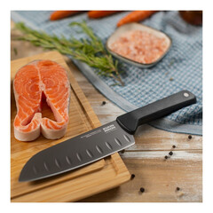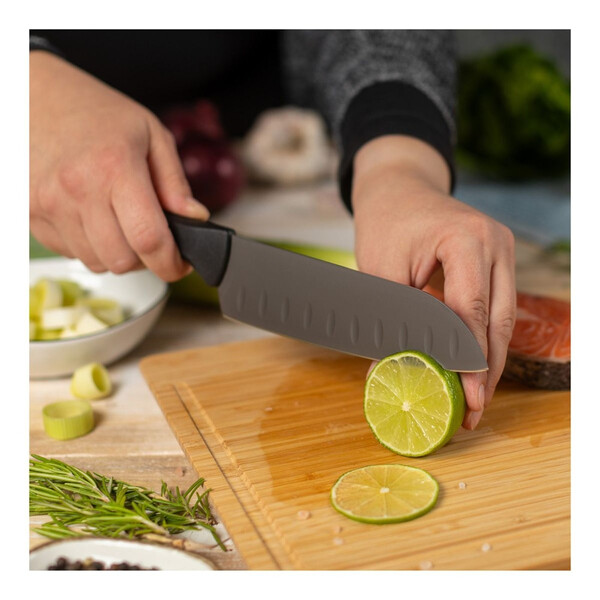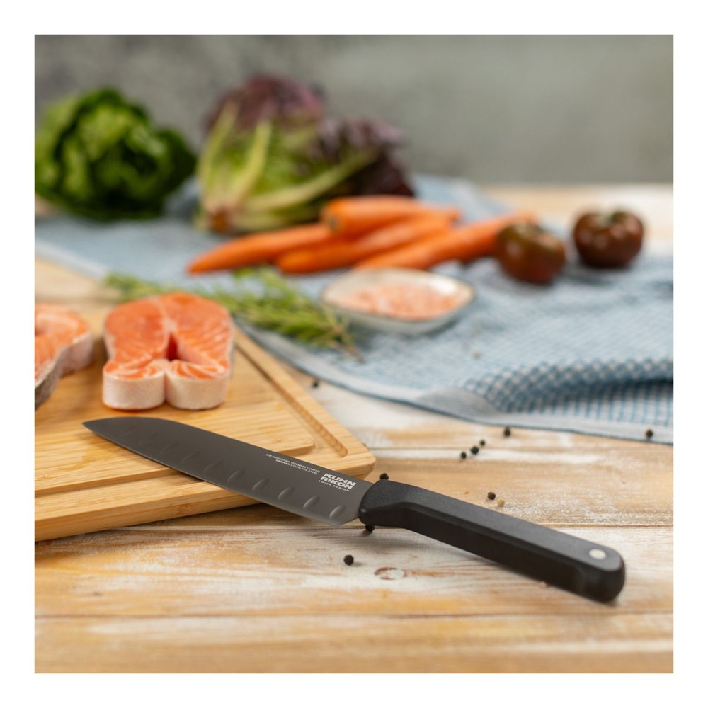 Ножът ICED Santoku с острие с вдлъбнатини гарантира, че нарязаната храна пада лесно. Универсален за употреба, можете лесно да режете, нарязвате на кубчета и нарязвате храни като риба, месо или зеленчуци.