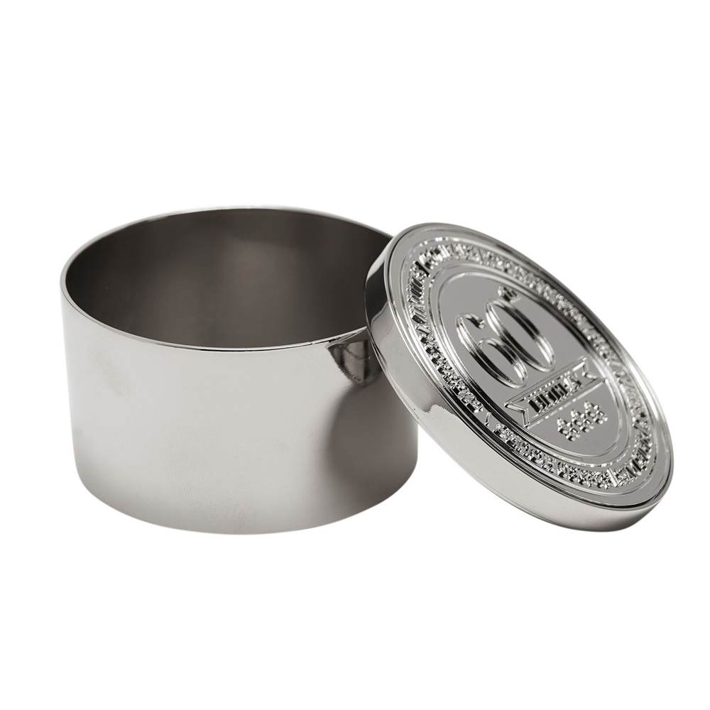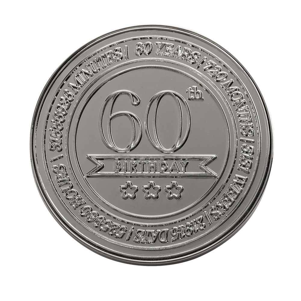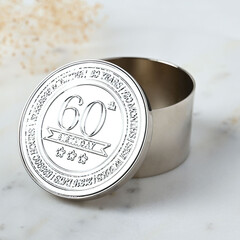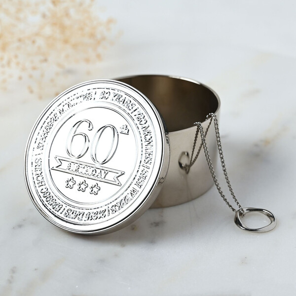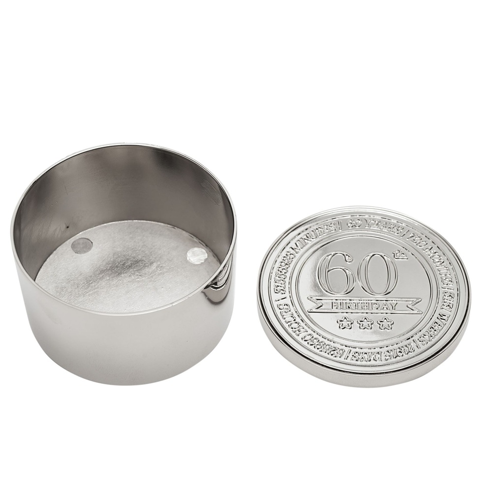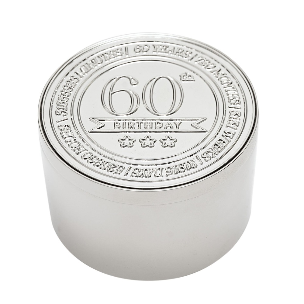 Кръглата кутия за дрънкулки Milestones – 60 е компактен сувенир, предназначен да отбележи важен рожден ден с ясен, показващ възрастта вид. Завършена в полиран сребрист цвят, тази кръгла кутия за дрънкулки е с релефен печат за 60-годишнина на капака за незабавно разпознаване на повода. Дизайнът с панти и верижка предлага практично място за съхранение на малки лични вещи, което я прави чудесно допълнение към колекциите подаръци за рожден ден. Марка: Celebrations® Тегло на продукта: 0.1250 кг Размери на продукта: В 40, Ш 60, Д 60 мм Основен цвят: Сребрист Размери на опаковката: В 42, Ш 60, Д 66 мм