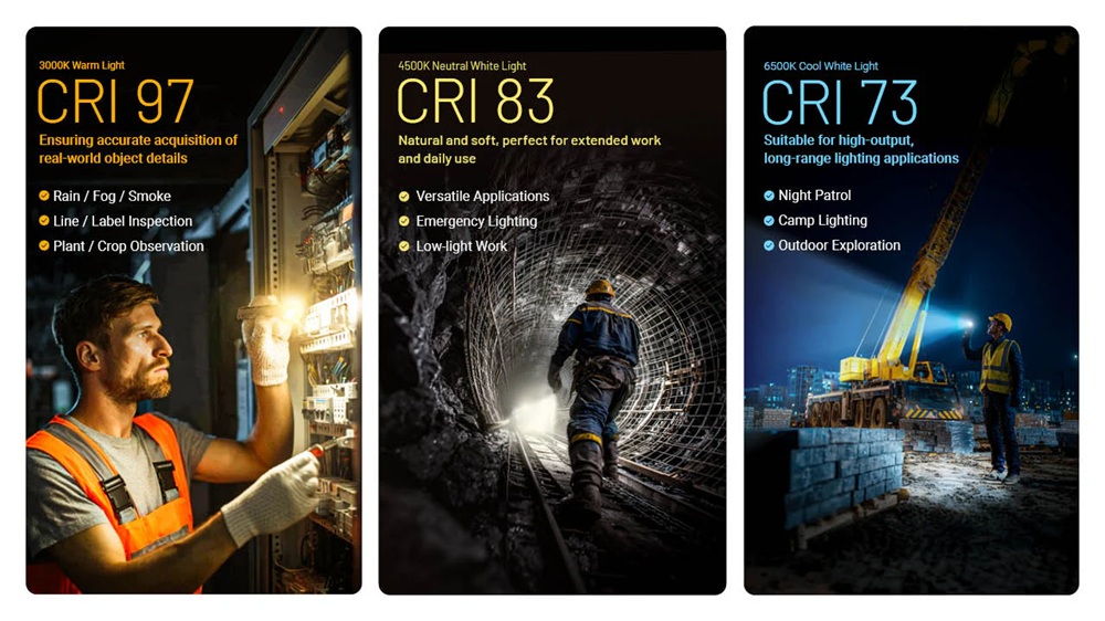 Цвят на лъча 3000K топла светлина (CRI 97), 4500K неутрална бяла светлина (CRI 83), 6500K студена бяла светлина (CRI 73)