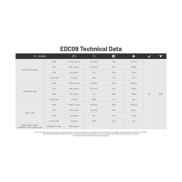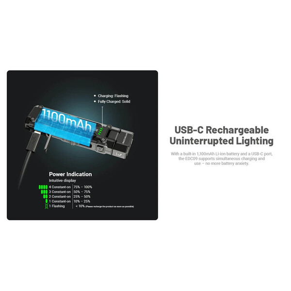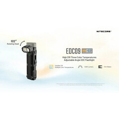 Nitecore EDC09 е ярко фенерче с плосък профил, което съчетава голяма мощност с компактен дизайн, създаден както за работа, така и за приключения. То осигурява до 1600 лумена с лъч, достигащ 264 метра, осигурявайки надеждна видимост, когато имате нужда от нея. Четири нива на яркост ви позволяват да настроите светлината към заобикалящата ви среда, а предупредителна светкавица от 200 лумена добавя допълнителна безопасност по време на спиране край пътя или аварийни ситуации.