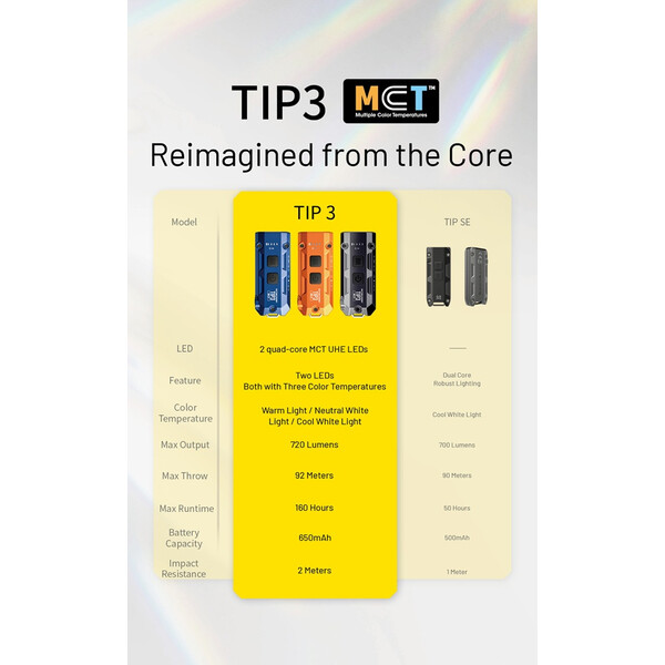 Nitecore TIP3 е компактен фенер с ключодържател, проектиран като интелигентно подобрение на TIP SE, осигуряващ по-голяма яркост и гъвкавост в същия удобен за джоба размер. С до 720 лумена и лъч, достигащ около 100 ярда, той осигурява надеждна светлина за ходене през нощта, придвижване в тъмни пространства или справяне с прекъсвания на захранването - без обема на фенерче с пълен размер.