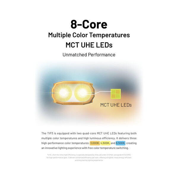 Това, което отличава TIP3, е способността му да превключва между три цветни температури, за да отговаря на различни ситуации. Използвайте 3000K топла светлина за четене или близки задачи, които са по-лесни за очите, 4500K неутрално бяло за естествено ежедневно осветление или 6500K студено бяло, когато се нуждаете от максимална яркост на открито. Лесното управление с два бутона улеснява работата, с бърз достъп до Turbo и ултра нисък режим за фино осветление с ниски отблясъци.