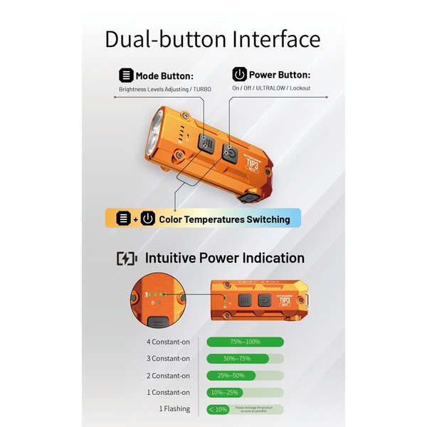 TIP3 работи с вградена акумулаторна батерия и предлага до 160 часа работа на най-ниската си настройка. Зареждането чрез USB-C прави презареждането бързо и удобно, а фенерчето може да се използва по време на зареждане. Режимите на заключване помагат за предотвратяване на случайно активиране, а ясните индикатори за батерията ви информират за нейния статус. Свалящ се клипс ви позволява да прикрепите TIP3 към джоб, чанта или шапка за употреба без ръце, в допълнение към носенето на ключодържател. Издръжлив, водоустойчив и лесен за употреба, NITECORE TIP3 е надежден фенер за ежедневно носене, създаден за ежедневието.