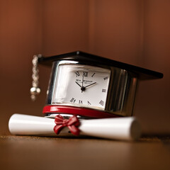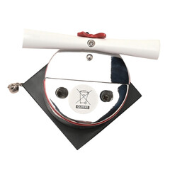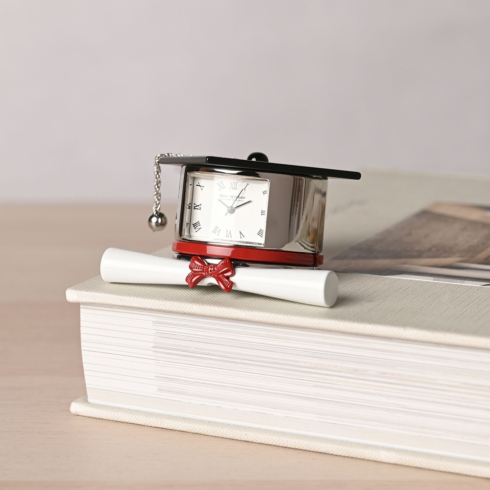 Миниатюрен часовник с шапка за абитуриент и свитък от WILLIAM WIDDOP®. Този ослепителен часовник за абитуриент има вечен стил, който би допълнил всяко нощно шкафче или камина в хола. Дизайнът на часовника показва значително внимание към детайла. Циферблатът е с атрактивен римски цифри и тънки съвременни стрелки. Циферблат: Римски Звънец: Не Тип механизъм: Кварцов Ограничения: Да не се използва като играчка Основен материал: Метална сплав Основен цвят: Черен Включена батерия: Да Марка: William Widdop® Държава на произход: Китай Тип батерия: B377 / RW329 / SR626 Размери на опаковката: В 56, Ш 64, Д 100 мм Размери на продукта: В 40, Ш 68, Д 62 мм Тегло на продукта: 0.1600 кг