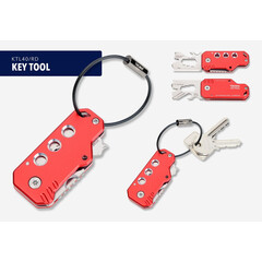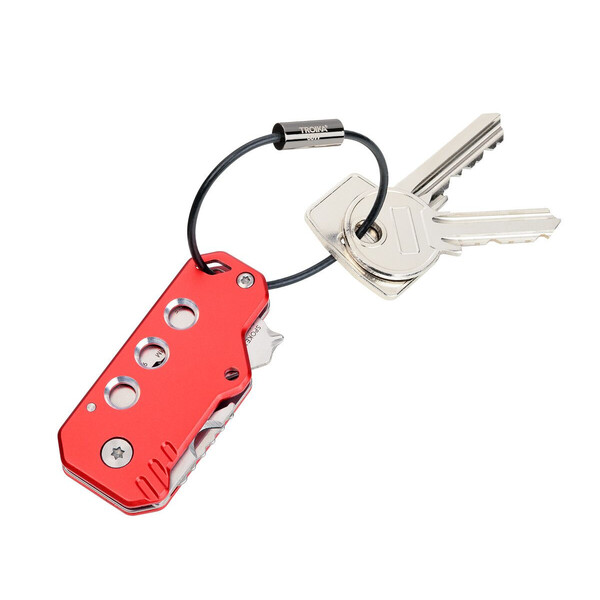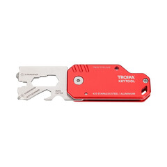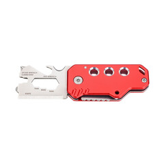 Мини инструмент с 11 функции, нож, ключодържател (тел), резачка за въже, отварачка за бутилки, шестограмен ключ (4 размера), кръстата и права отвертка, неръждаема стомана 420 / алуминий, мат, червен Размер: 100 x 40 x 76 мм Тегло: 37 гр