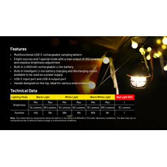 Освен това, има множество начини за използване на LR40 - поставяне, носене в ръка или окачване в палатката, като дръжката е с изпъкнал дизайн за по-стабилно окачване. Нещо повече, LR40 има първокласна и надеждна конструкция. Корпусът от ABS пластмаса е издръжлив и устойчив на удар, а стабилната метална основа е проектирана с висока защита от твърдост.