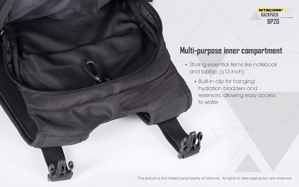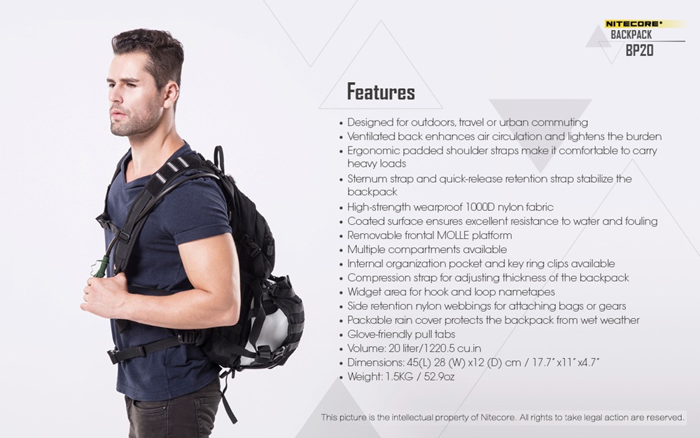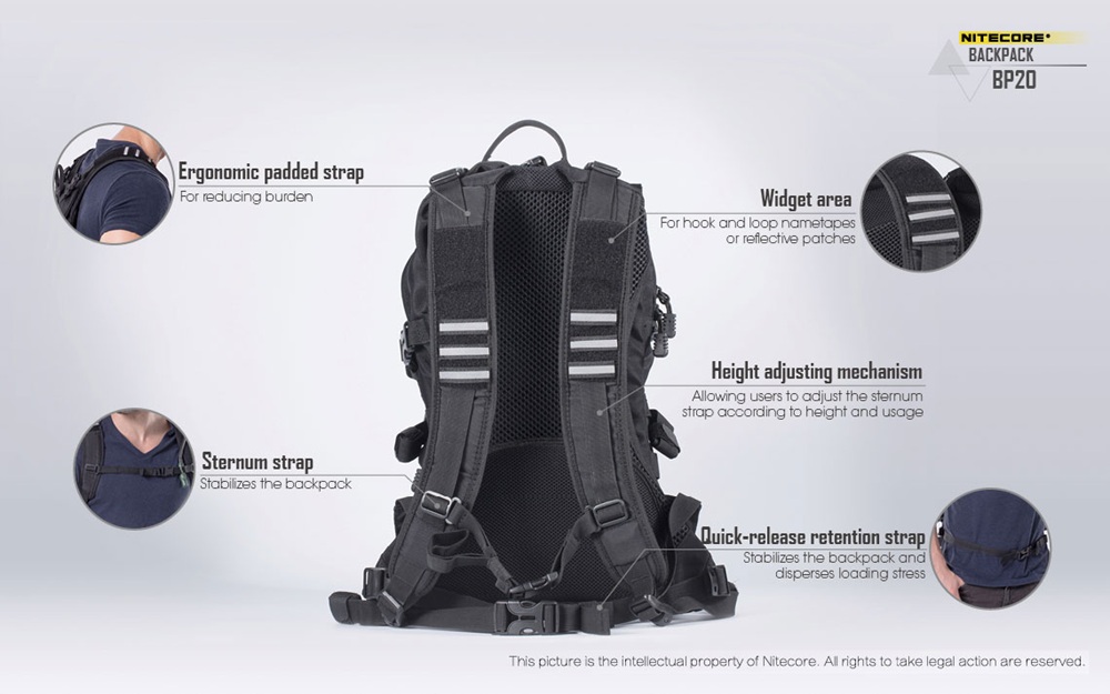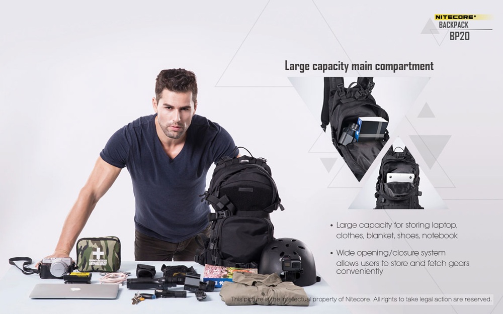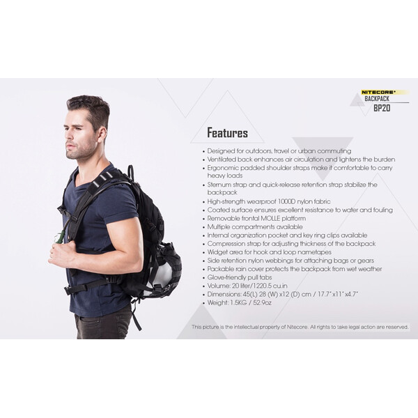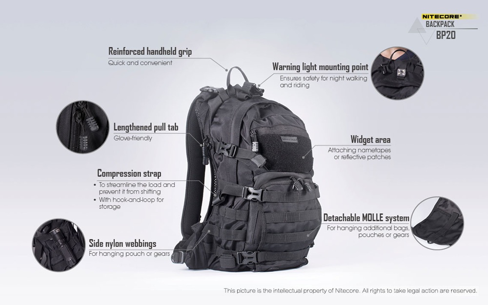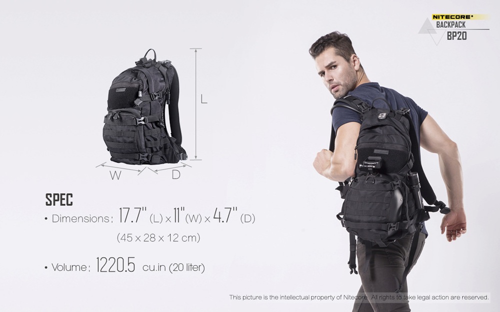 BP20, първата раница на NITECORE, се предлага с вградена MOLLE система и множество отделения. Тя предлага голям капацитет от 20 литра, което я прави перфектен продукт за различни сценарии - къмпингуване на открито, преходи с раница или туризъм, кратки пътувания, градско пътуване и др.