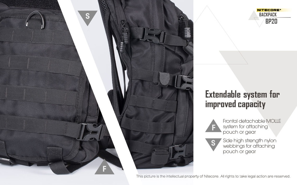 Фронталната MOLLE система и страничните найлонови ленти, подходящи за окачване на допълнителни торбички, по-малки чанти или екипировка, са предназначени да увеличат приложимостта на раницата.