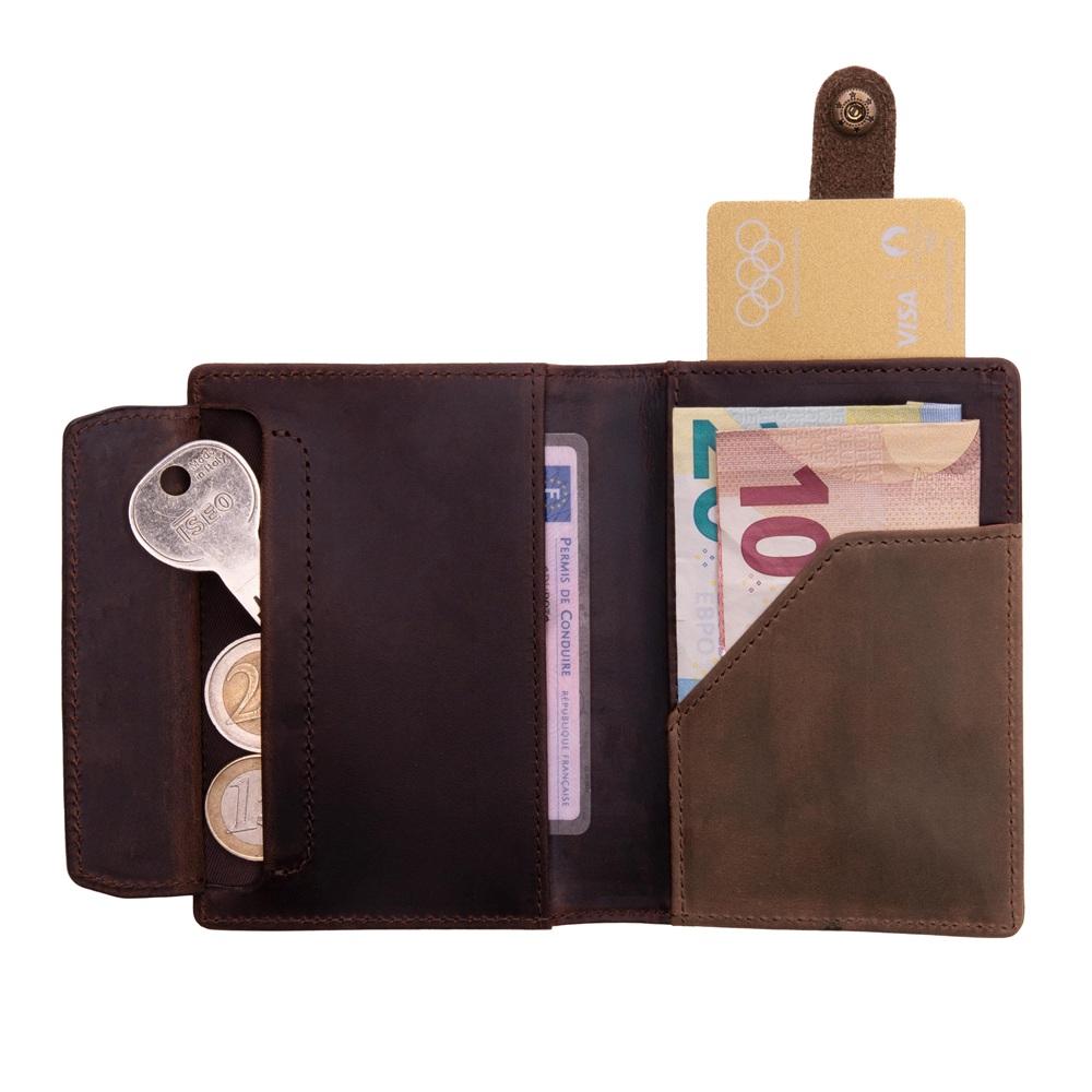 Място за всичко Ако имате нужда от изключително плосък портфейл, който е достатъчно голям за всички ваши най-необходими вещи, тогава HANDY MAX е за вас. Той има отделение за до 10 карти. Но истинският бонус е, че имате 3 допълнителни отделения за други неща. Има място за вашите банкноти, място за стария ви документ за самоличност и затворено, магнитно отделение за ресто. Този тънък портфейл е изработен от 100% естествена кожа. С течение на времето тя ще развиие патина, правейки портфейла ви още по-красив. Подобно на по-малкия си брат, HANDY, HANDY MAX разполага с гениална система за издърпване за лесно съхранение и изваждане на вашите карти. Добавихме дори anti-RFID защита за вашите карти. Тя предотвратява четенето на вашите чипове от картите и кражбата на вашите данни. Естествена кожа - Здрав и стилен Анти-RFID защита - Банковите карти са защитени Издърпваща се система за 10 карти - Гениална и ултрапрактична Отделение за банкноти - Безопасно и сигурно Място за стари лични карти и шофьорски книжки - Място за всеки Затворени и магнитни отделения за монети - Нищо не остава Д 8,5 x В 12 см - Удобен за носене 120 гр - Лек като перце