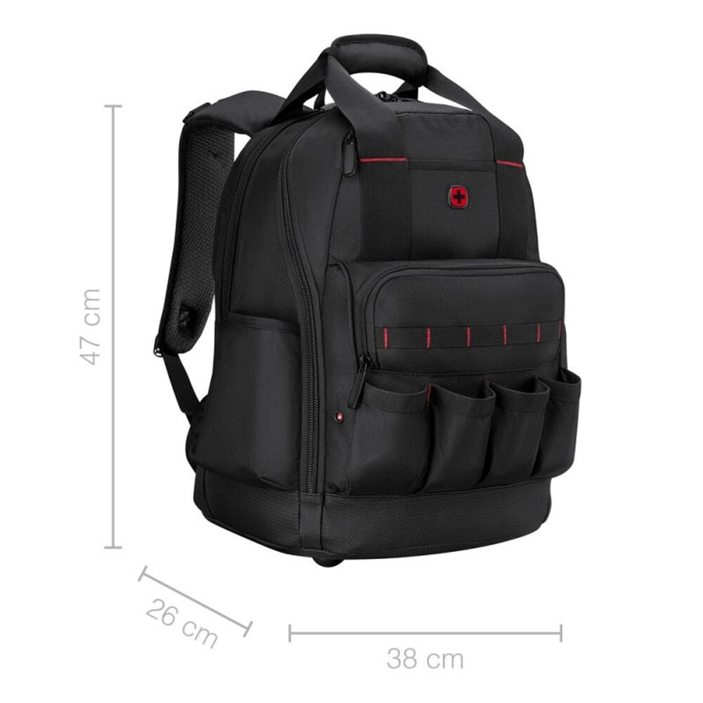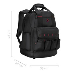 Проектирана за монтажници, техници и строителни работници, тази раница е оборудвана с различни джобове за съхранение на ръчни инструменти, пирони, чукове, отвертки и други.