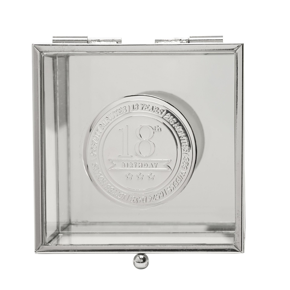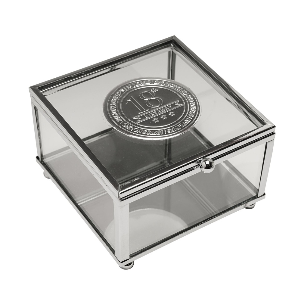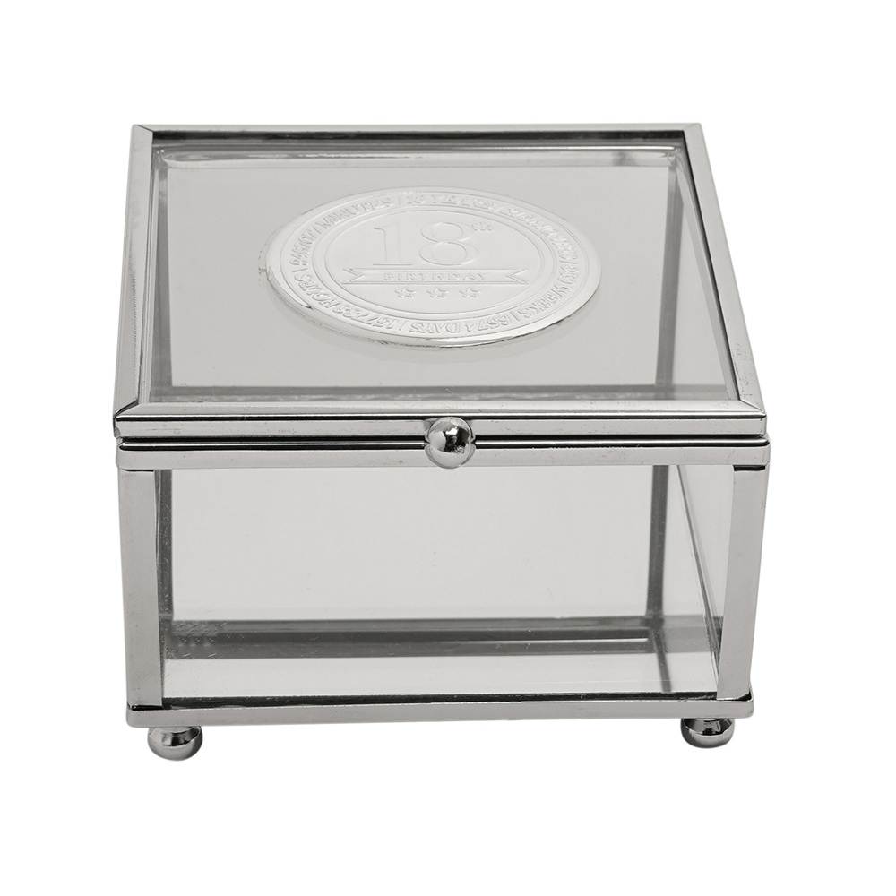 Стъклената кутия за бижута Milestones с метална значка “18“ е стилен сувенир, предназначен да отбележи знаменателен 18-ти рожден ден. С прозрачни стъклени панели и метална значка „18“, вградена в капака, тази кутия за бижута предлага изискан начин за съхранение на бижута, сувенири или малки сувенири.