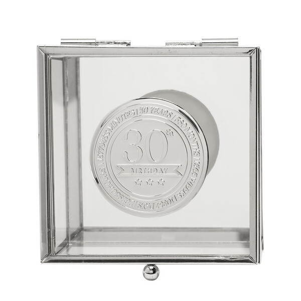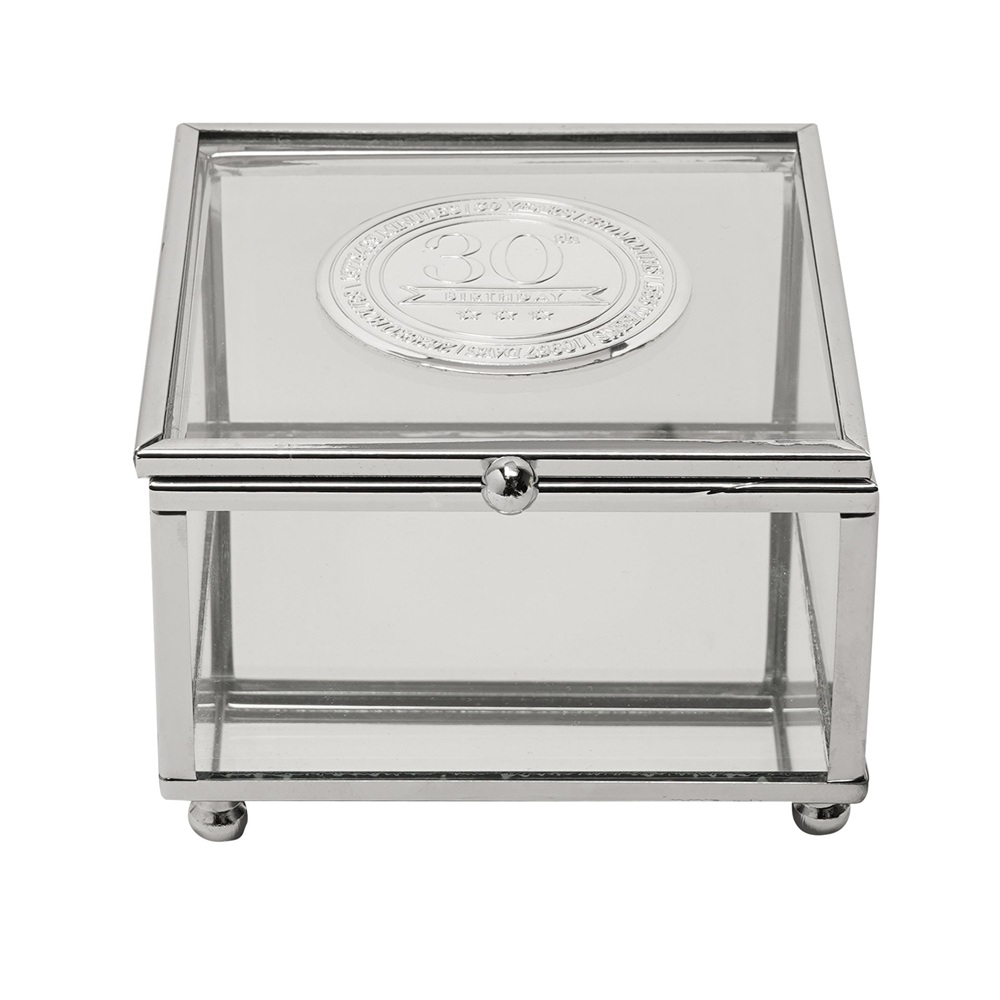 Стъклената кутия за бижута Milestones с метална значка “30“ е стилен сувенир, предназначен да отбележи знаменателен 30-ти рожден ден. С прозрачни стъклени панели и метална значка „30“, вградена в капака, тази кутия за бижута предлага изискан начин за съхранение на бижута, сувенири или малки сувенири.