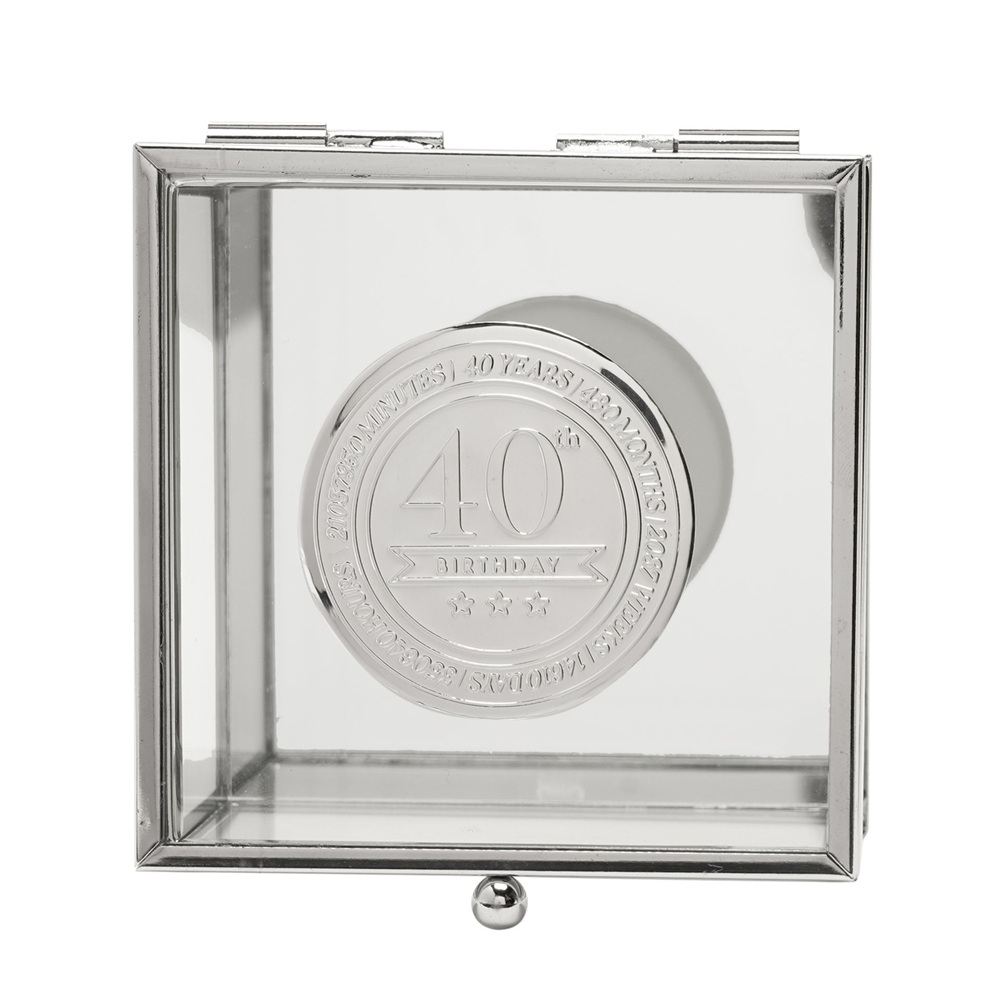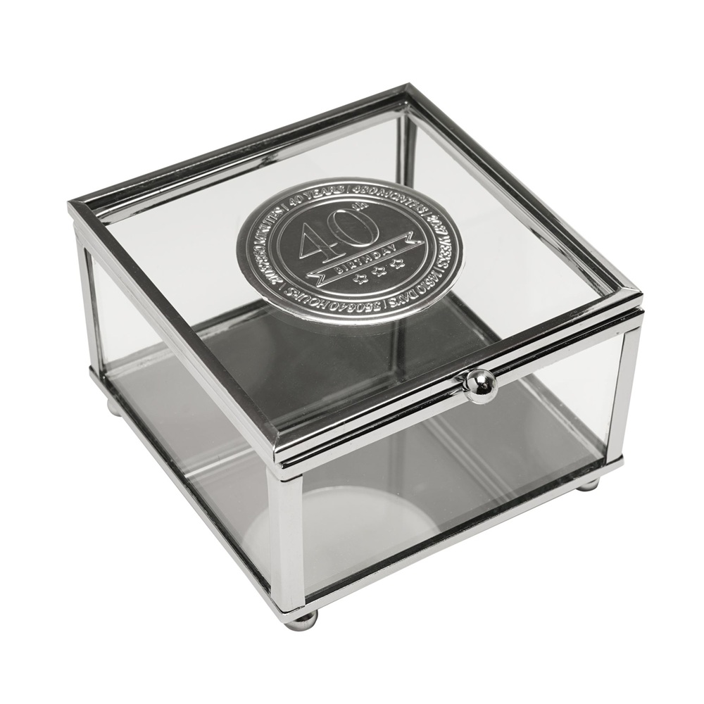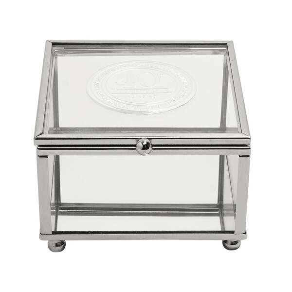 Стъклената кутия за бижута Milestones с метална значка “40“ е стилен сувенир, предназначен да отбележи знаменателен 40-ти рожден ден. С прозрачни стъклени панели и метална значка „40“, вградена в капака, тази кутия за бижута предлага изискан начин за съхранение на бижута, сувенири или малки сувенири.