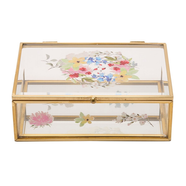Кутия за дрънкулки и бижута от SOPHIA®. Тази атрактивна кутийка за дреболии е вдъхновена от природата и заема почетно място, когато е изложена в спалнята. Прозрачната стъклена кутийка за дреболии се отличава с лъскаво покритие, допълнено с цветни щампи на цветя и меден кант. Капакът на панти се отваря, за да разкрие огледална основа. Марка: Sophia® Основен материал: Стъкло Основно покритие: Лъскаво Вторичен материал: Мед Тегло на продукта: 0.400 кг Размери на продукта: В 50, Ш 150, Д 110 мм Размери на опаковката: В 95, Ш 210, Д 135 мм Основен цвят: Многоцветен