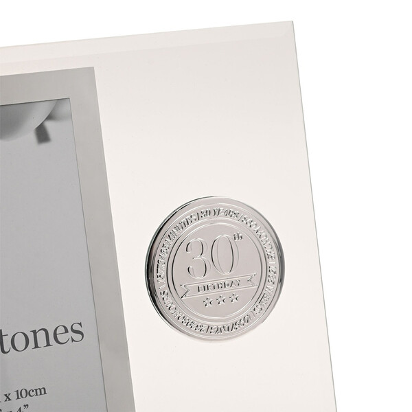 Стъклената рамка Milestones с метална значка “30“ е стилен сувенир, предназначен да отбележи знаменателен рожден ден. С елегантен стъклен дизайн и вградена метална значка „30“, тази рамка е идеална за показване на любима снимка от специално тържество.