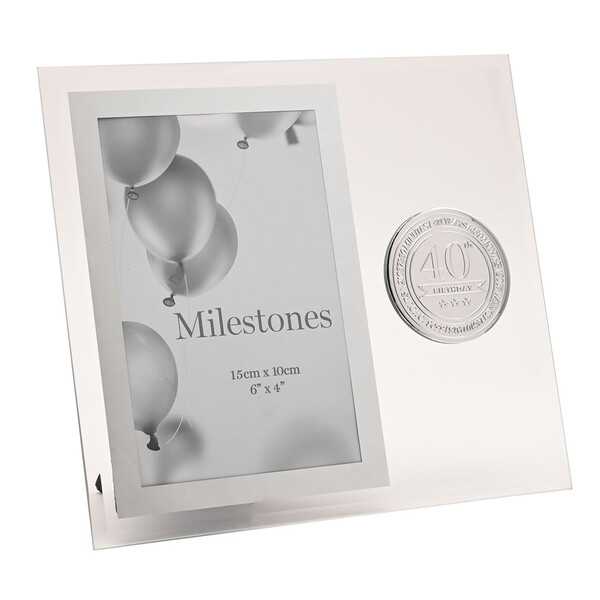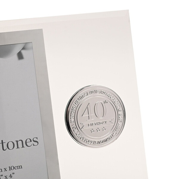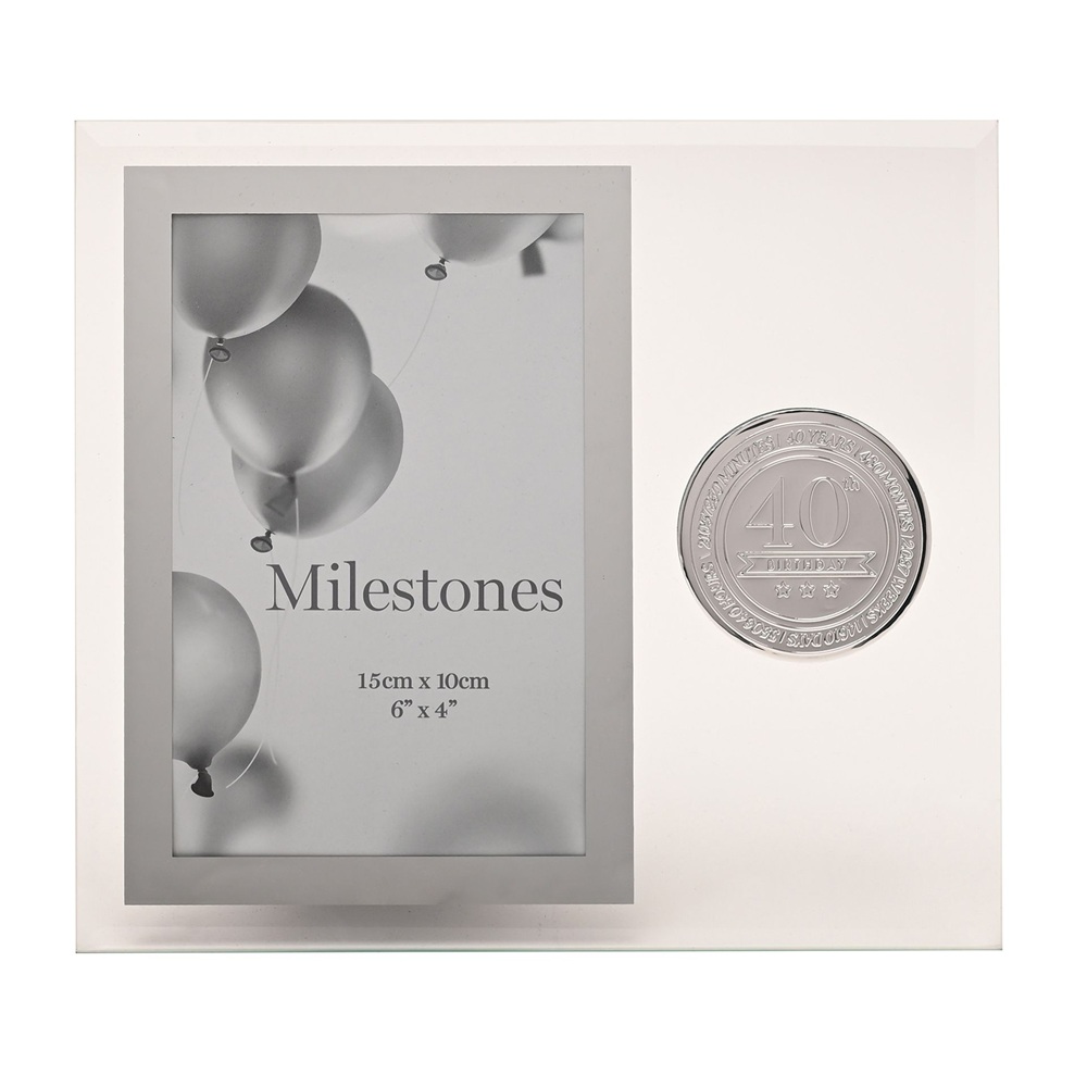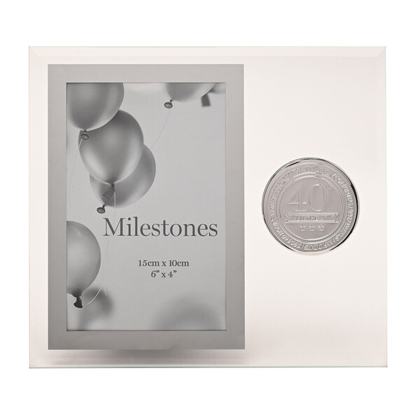 Стъклената рамка Milestones с метална значка “40“ е стилен сувенир, предназначен да отбележи знаменателен рожден ден. С елегантен стъклен дизайн и вградена метална значка „40“, тази рамка е идеална за показване на любима снимка от специално тържество.